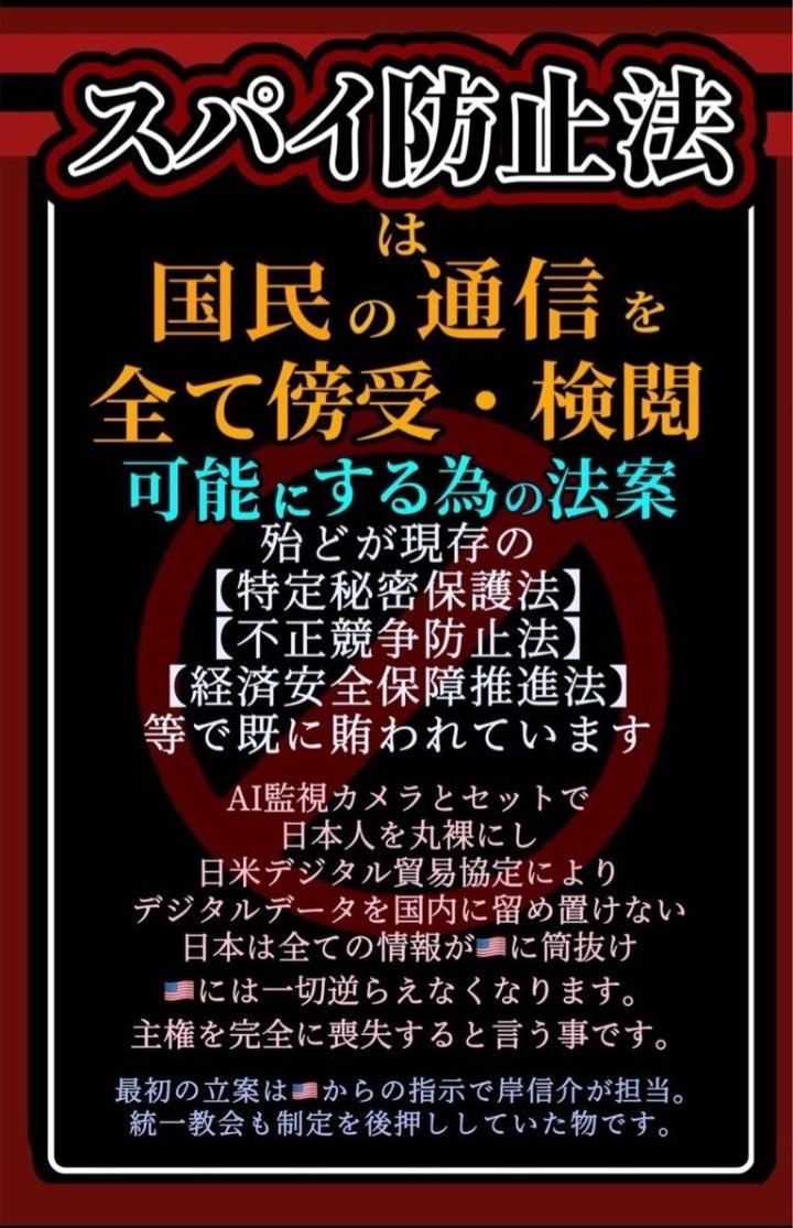 返信先:@nomatteryama#スパイ防止法反対者はスパイ と引用TWの様な統一教会(悪政5党&参政党&保守党&N党)信者は言うが,#嘘つきは統一教会の始まり で,#スパイ防止法は現代の治安維持法 なので #スパイ防止法に賛成するのはスパイだけ である。x.com/2014wrwc/statu… x.com/3tsu84/status/… x.com/nomatteryama/s… pic.x.com/5X6vP5aTwA