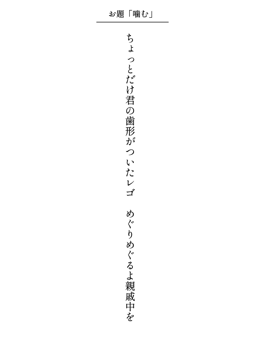 ちょっとだけ君の歯形がついたレゴ めぐりめぐるよ親戚中を / 土佐アヴァンチュールぱす汰 #毎日文学 #短歌 #噛むをテーマに作品をつくる pic.x.com/O1RB6jGTrH x.com/tankazine/stat…