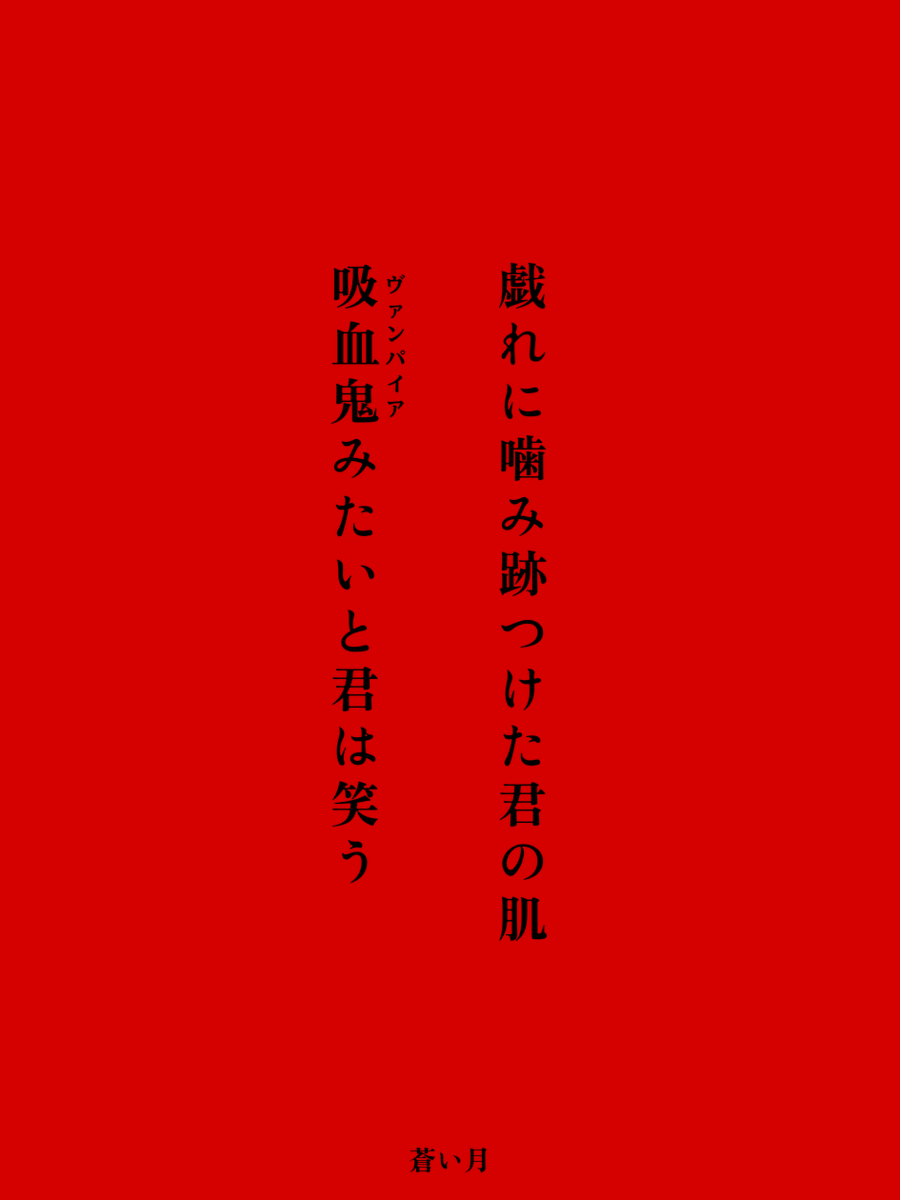 戯れに噛み跡つけた君の肌 吸血鬼《ヴァンパイア》みたいと君は笑う/蒼い月 #毎日文学 #短歌 #噛むをテーマに作品をつくる pic.x.com/NgSK81KxbL x.com/tankazine/stat…