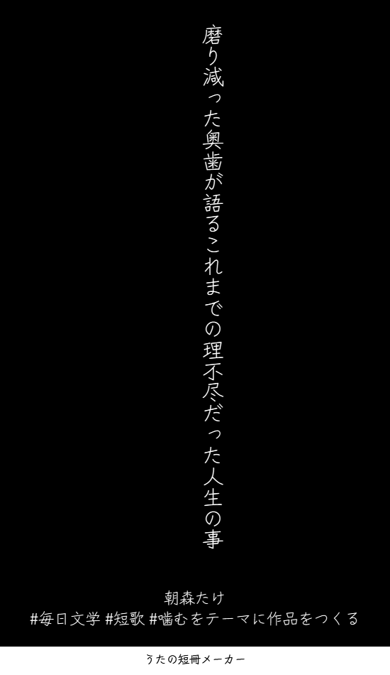 磨り減った奥歯が語るこれまでの理不尽だった人生の事 #毎日文学 #短歌 #噛むをテーマに作品をつくる pic.x.com/i6FGpxelBF x.com/tankazine/stat…