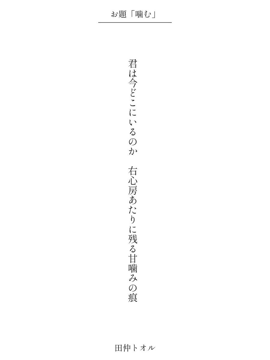 君は今どこにいるのか 右心房あたりに残る甘噛みの痕/田仲トオル #毎日文学 #短歌 #噛むをテーマに作品をつくる pic.x.com/H2NH5iD5t6 x.com/tankazine/stat…