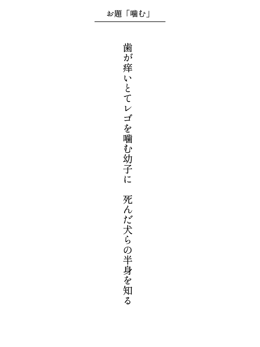 歯が痒いとてレゴを噛む幼子に 死んだ犬らの半身を知る / 土佐アヴァンチュールぱす汰 #毎日文学 #短歌 #噛むをテーマに作品をつくる pic.x.com/wV2Z6e6CW6 x.com/tankazine/stat…