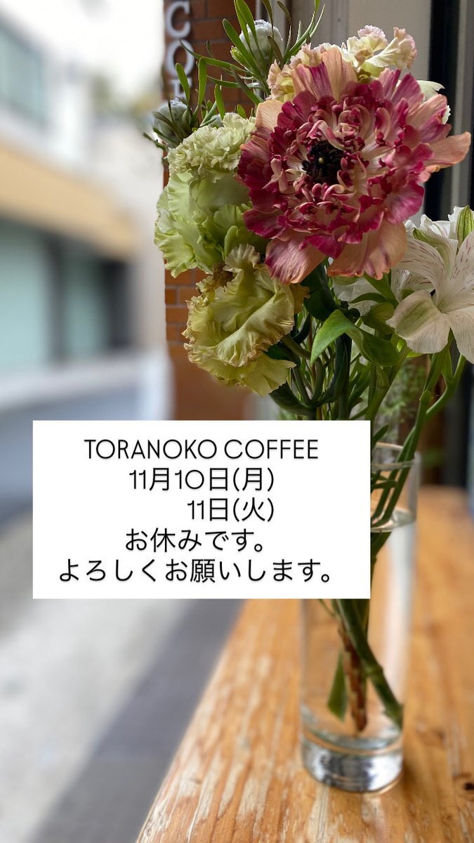 トラノココーヒー11月10日(月)、11日(火)はお休みです。よろしくお願いします。 #Tokyo #四谷 #toranoko #トラノコ #スペシャルティコーヒー #自家焙煎 #ベイクドスイーツ #ハンドドリップ pic.x.com/kw6tq0v9Pa
