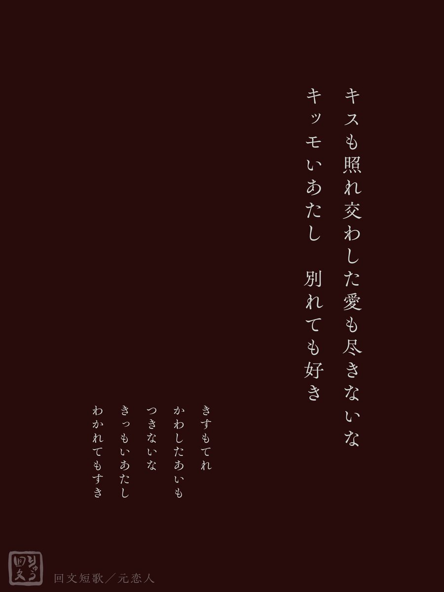 回文短歌/元恋人 #回文 #回文短歌 #短歌 キスも照れ交わした愛も尽きないな キッモいあたし 別れても好き pic.x.com/8RVbcpulMN x.com/tankazine/stat…