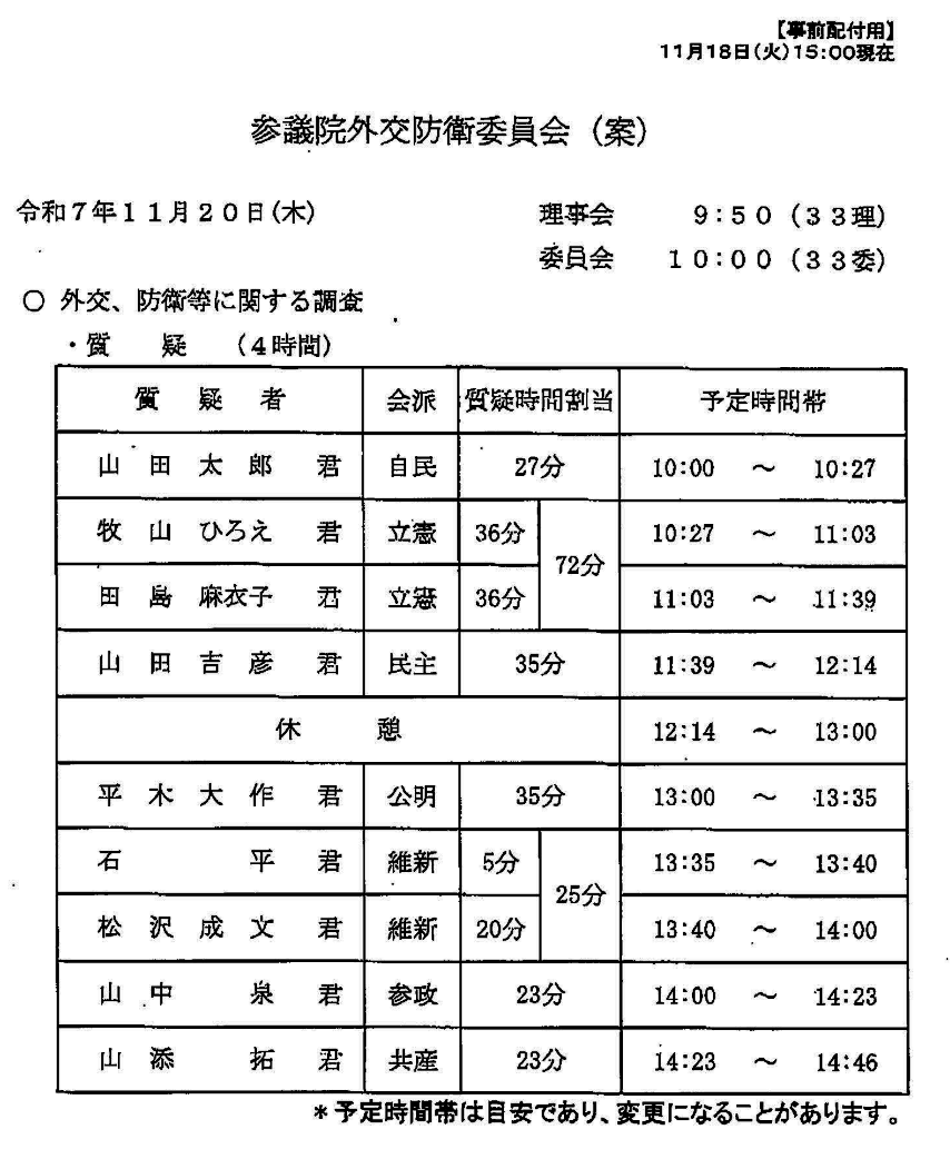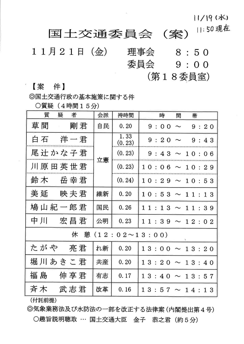 2025/11/19の審議予定が更新されています 09:00衆-内閣委/法務委/財務金融委/厚生労働委 09:30衆-文部科学委 10:00衆-国土交通委 10:00参-災害対策及び東日本大震災復興特別委/北朝鮮によ(以下略 kokkairadar.com/cms/guide/ #国会を見よう #kokkai