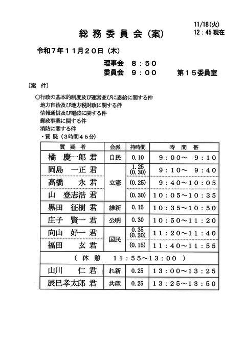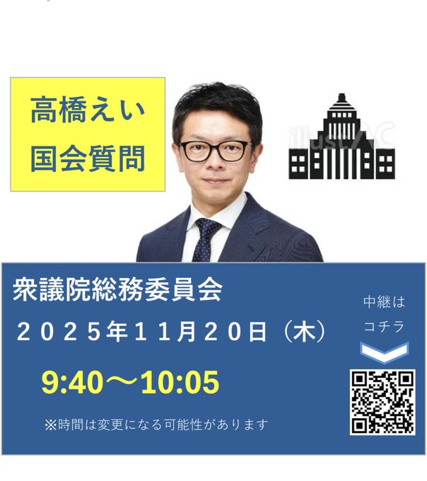 #国会中継 #国会を見よう 2025/11/20 衆議院 中継中 総務委員会、農林水産委員会 10:00~ 憲法審査会 13:20~ 国家基本政策委員会 shugiintv.go.jp/jp/