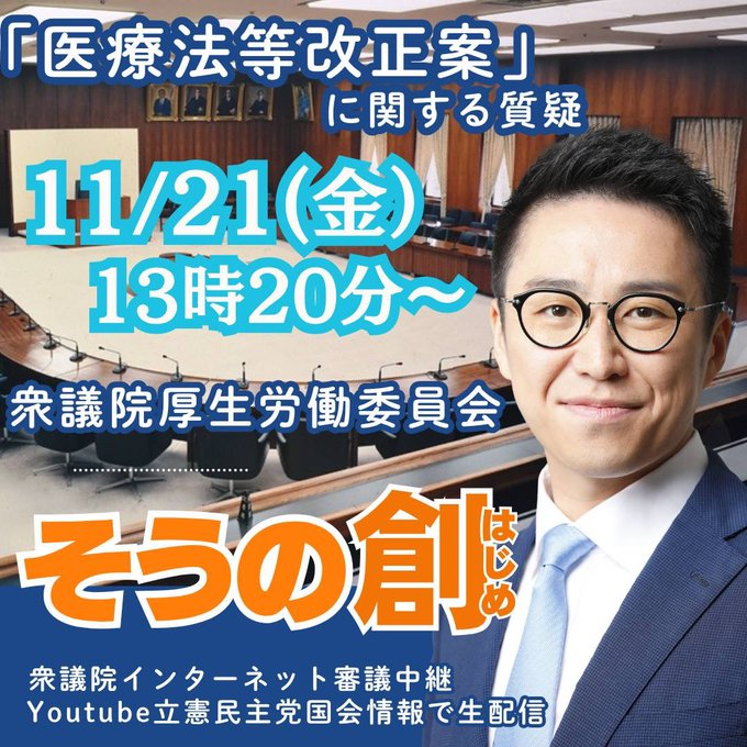 #国会を見よう 4⃣ 11月21日(金) #立憲民主党・無所属 【厚生労働委員会】9:40早稲田ゆき 10:10酒井なつみ 10:40山井和則 11:10大塚小百合 11:45斉藤ゆうき 13:20そうの創 13:55中島かつひと #国会中継 #衆議院 #立憲民主党 shugiintv.go.jp/jp/ youtube.com/watch?v=n6FRHI… pic.x.com/3krwor6cPC