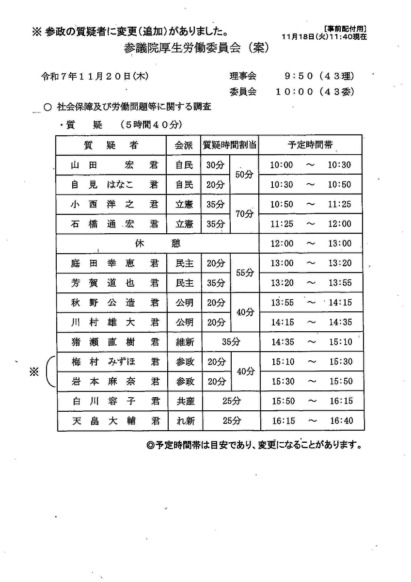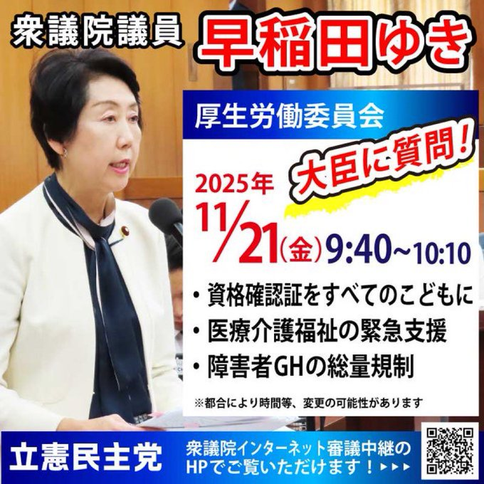 #国会を見よう 8⃣ 11月20日(木) 参議院 #立憲民主・社民・無所属 【厚生労働委員会】10:50小西ひろゆき 11:25石橋みちひろ youtube.com/live/Q63JkrBBo… 【内閣委員会】10時 【財政金融委員会】10時 #国会中継 #参議院 #立憲民主党 社会保障 労働 webtv.sangiin.go.jp/webtv/index.php x.com/basokaki30/sta… pic.x.com/6APrXd4mAZ