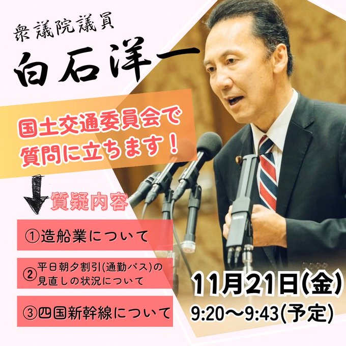 #国会を見よう 3⃣ 11月21日(金) #立憲民主党・無所属 【国土交通委員会】9:20白石洋一 9:43尾辻かな子 1 0:06かわはらだ英世 10:29鈴木岳幸 youtube.com/watch?v=hnaB_0… 【経済産業委員会】9:30大西健介 10:05山岡達丸 10:30山崎誠 11:05今井雅人 youtube.com/watch?v=8H7mex… #国会中継 #衆議院 #立憲民主党 pic.x.com/98NDkPuYgs