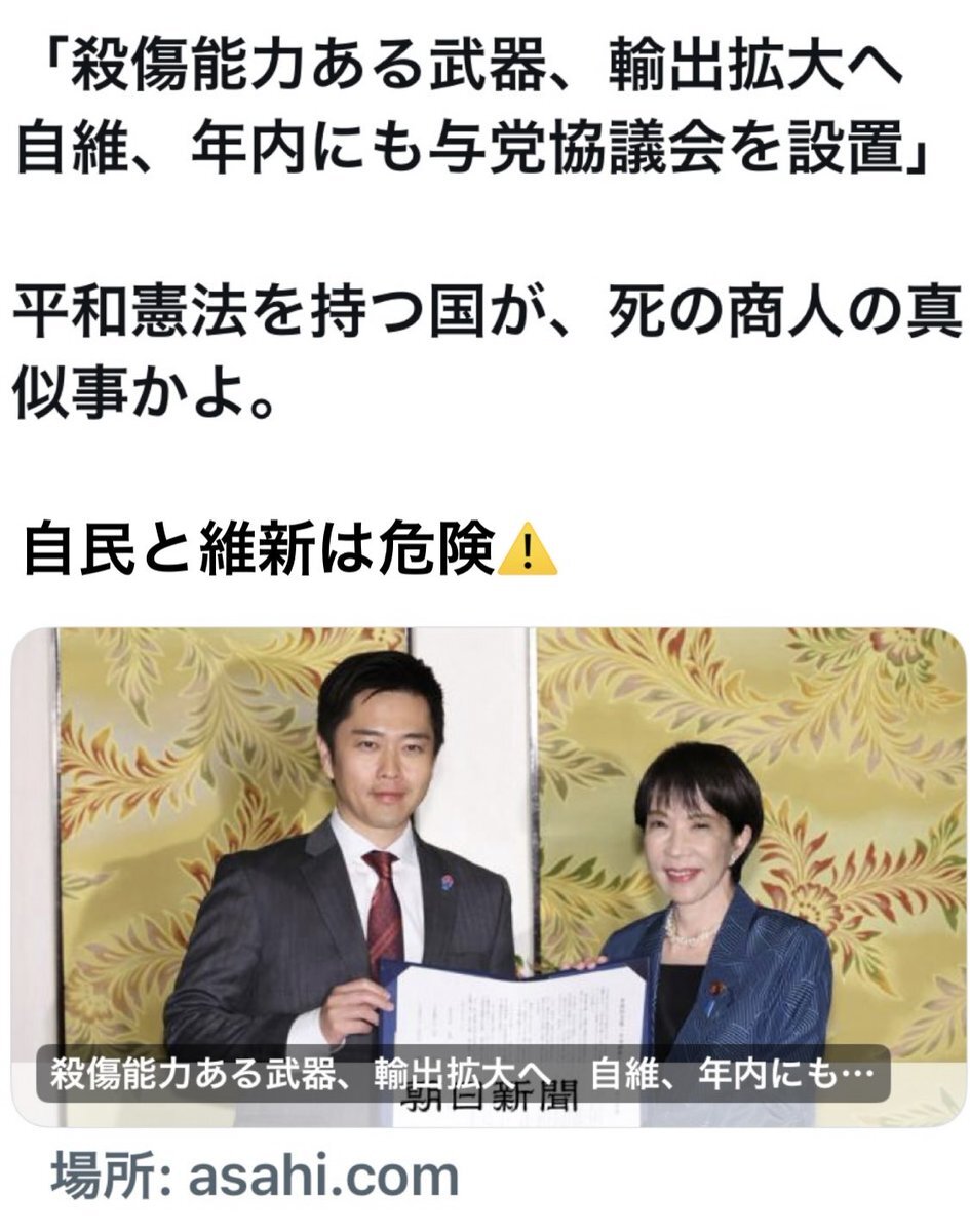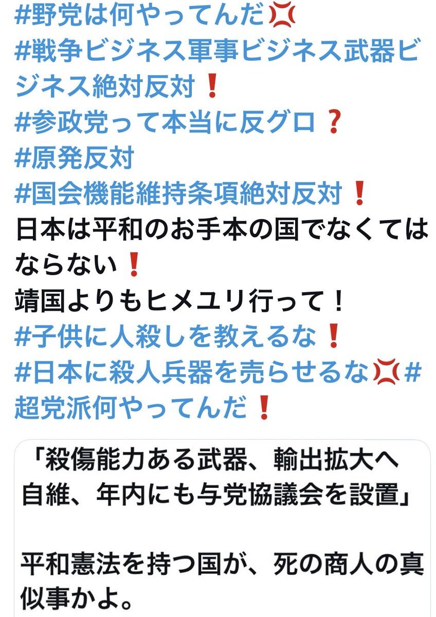 #れいわ支持者ととながりたい❗️ #戦争ビジネス軍事ビジネス武器ビジネス絶対反対 #国会機能維持条項絶対反対❗️ 軍産複合体傀儡 自民と維新は 本当に危険です!⚠️ 世界中の多くの人は戦争など 望んでいない❗️戦争の悲惨さを学ばない議員.政治家は即刻総辞職せよ❗️ 子供達に人殺しを教えるな💢 #原発反対 x.com/kokone_saron/s…
