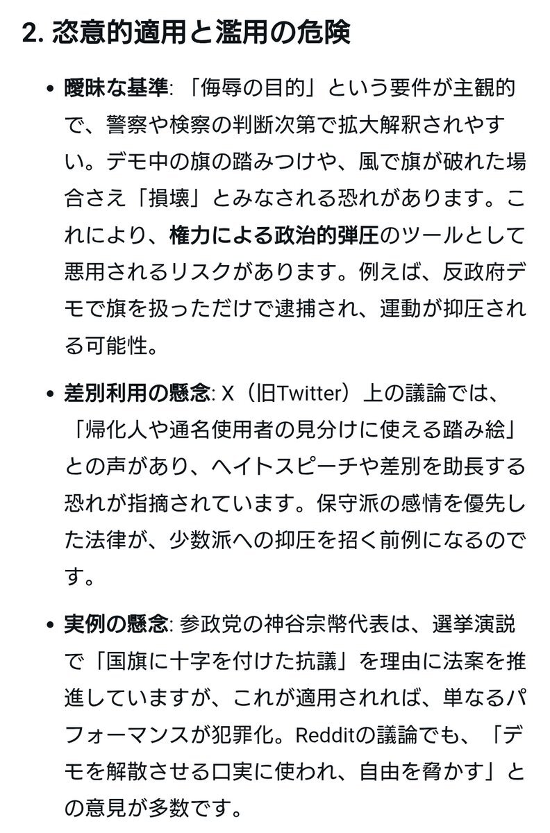 例えば、こういう写真を見て 日の丸が好きなんだな、愛国者なんだなって思う人と、我が国の国旗に何してんだよって思う人もいるかも知れないよね。 そういう人の主観で犯罪になるかどうか決まっちゃうのは危ないというか、慎重であるべきじゃないかってワシは思うけどな。
