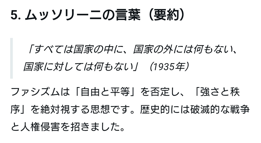 返信先:@shiraku666ファシズムは「自由と平等」を否定し、「強さと秩序」を絶対視する思想です。歴史的には破滅的な戦争と人権侵害を招きました #国会中継 #ファシズム #破滅的な戦争と人権侵害 #国旗毀損罪 #ファシズムの入口 pic.x.com/dBOwzSQJob