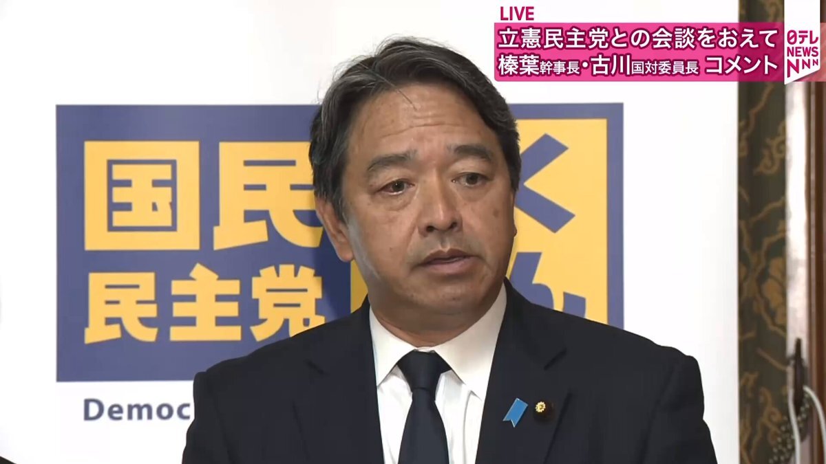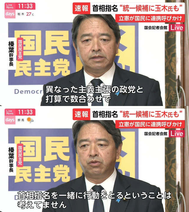 国民民主党の榛葉幹事長、立憲民主党との会談を受けて囲み取材。 「立憲民主党から『首班指名で玉木雄一郎を』と、立憲民主党党内でコンセンサスも取れていない話が冗談半分であった」 「憲法・安全保障・エネルギーで決定的に主義主張が異なる立憲民主党と数合わせや打算で手を結ぶことはない」