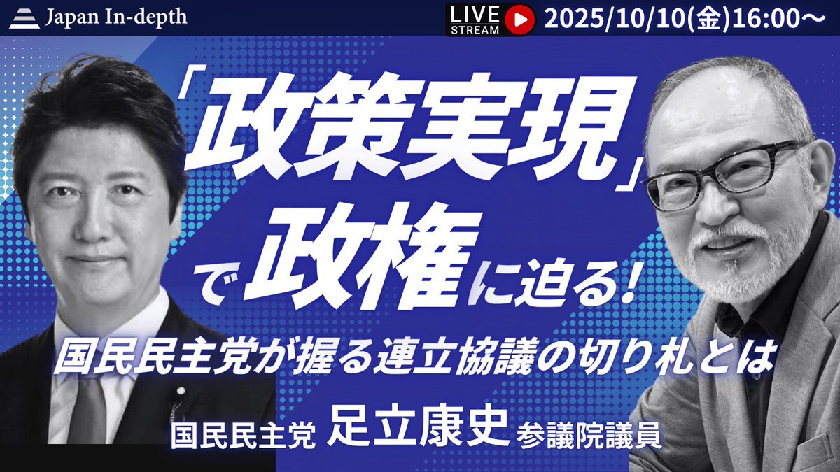 【緊急ライブ!Japan In-depthチャンネル】流動化する連立協議。国民民主の目指す道とは⁉️ 猟犬、足立康史参院議員出演!youtube.com/@japanin-depth… #国民民主党 #自民党 #連立協議 #公明党 #ジャパンインデプス