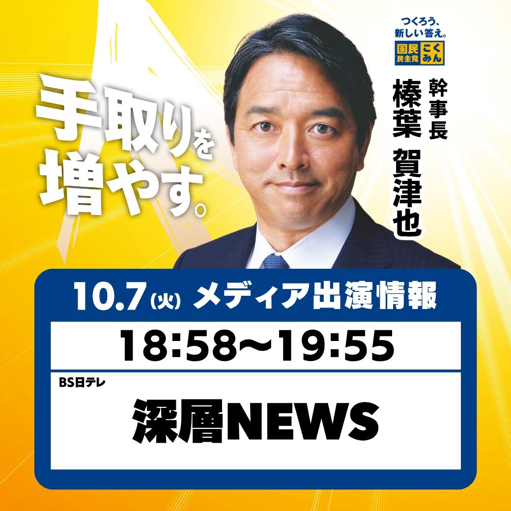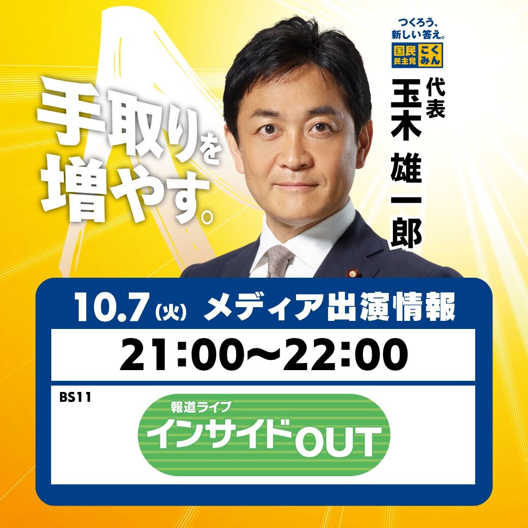 【出演情報】 本日10月7日(火)、 #玉木雄一郎 代表が以下の番組に出演します。ぜひご覧ください🐰 ◆BS11「報道ライブ インサイドOUT」 21:00〜22:00 bs11.jp/news/houdou-li… #国民民主党 #手取りを増やす