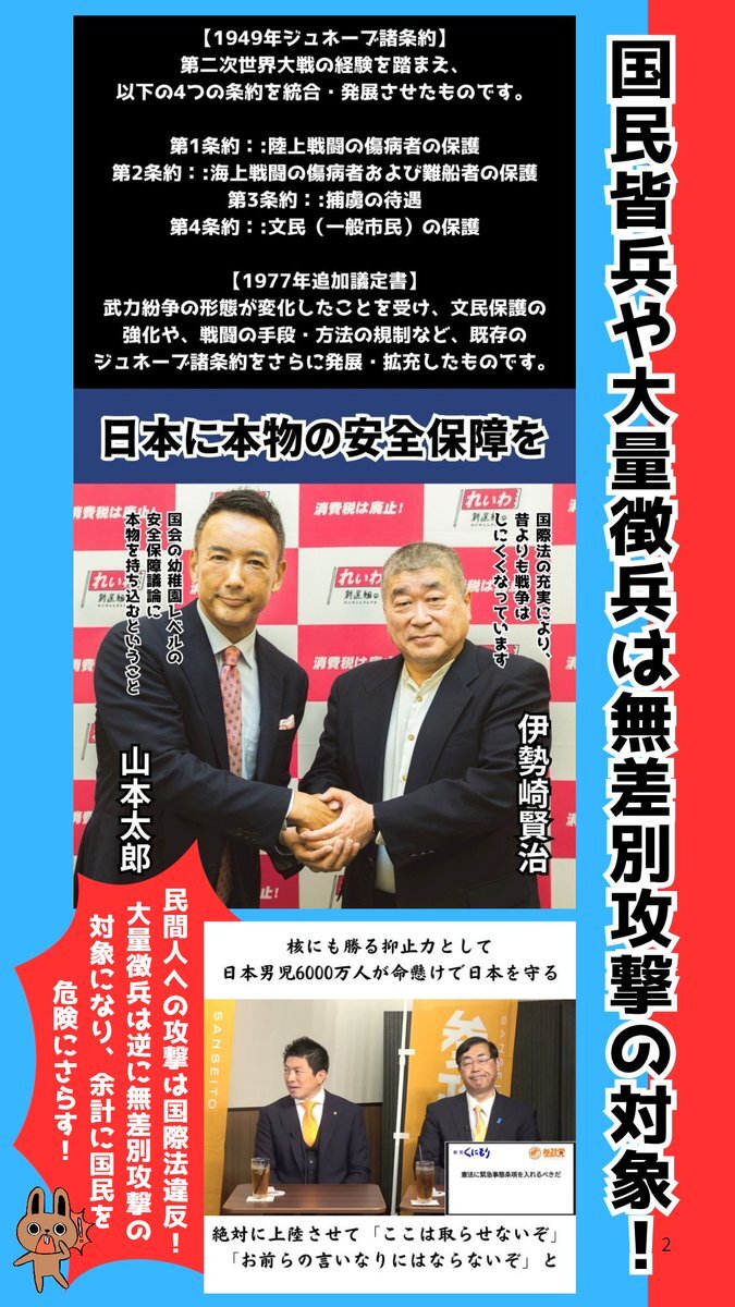 #国際法を知らずに日本は守れない 国民皆兵や大量徴兵は逆に無差別攻撃の対象になり得ます。 だからどこの政党よりも国際法に詳しいれいわ新選組を応援します! #れいわ新選組 #伊勢崎賢治 #ジュネーブ諸条約 #国連憲章旧敵国条項 #ジェノサイド条約 pic.x.com/0gmk4WxKWL x.com/madamechochoco…
