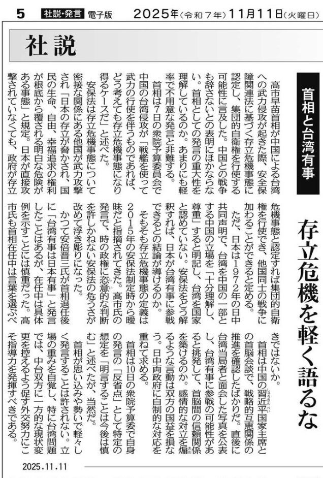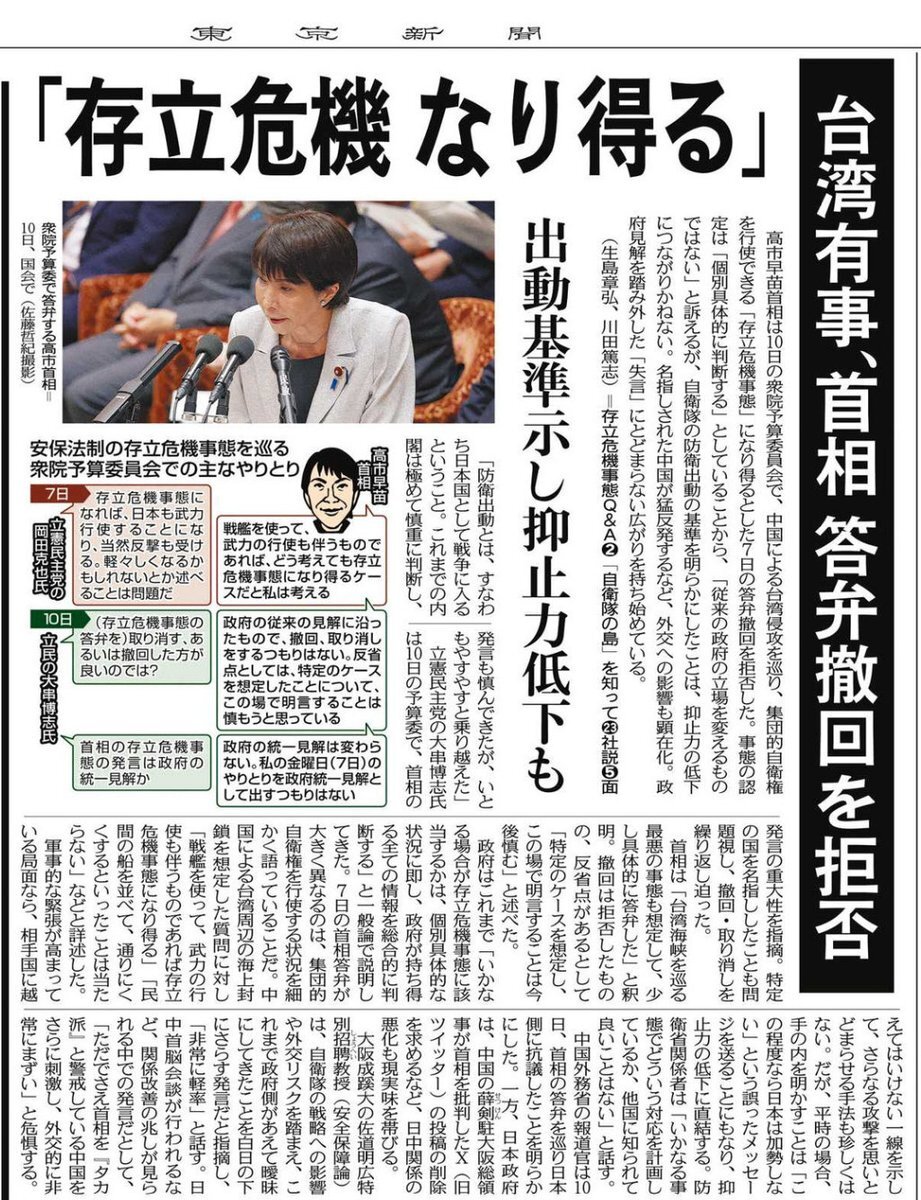 <社説>首相と台湾有事 存立危機を軽く語るな tokyo-np.co.jp/article/448387/