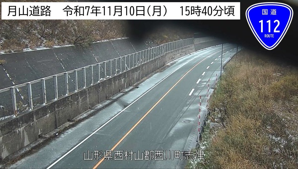 #雪みち情報 11月10日(月) 15時40分頃の #国道112号 #月山道路 の道路状況です 月山道路では、明日にかけて積雪及び路面凍結が予測されています! 今後の気象情報、道路情報に十分注意頂き、車でお出かけの際は #スタッドレスタイヤ #チェーン 等滑り止めを装着のうえ通行されますようお願いします pic.x.com/rZg83e5mi3