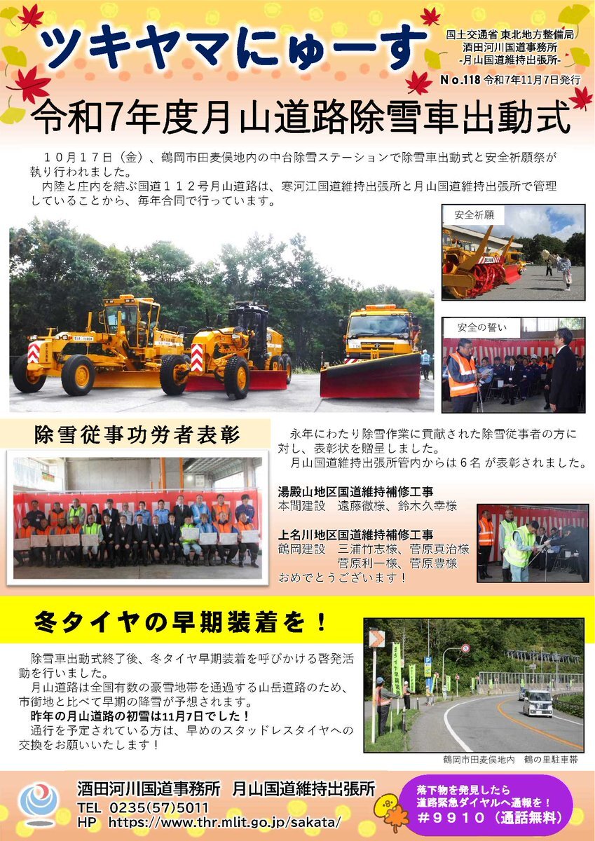 【出張所情報】月山国道維持出張所の広報「ツキヤマにゅーす第118号」を発行しました。今号では、10月17日(金)に行われた令和7年度 #月山道路 除雪出動式の様子をお届けします。 早めの冬タイヤ装着へのご協力よろしくお願いします。 #鶴岡市 #国道112号 pic.x.com/Z9a9oDHmaP