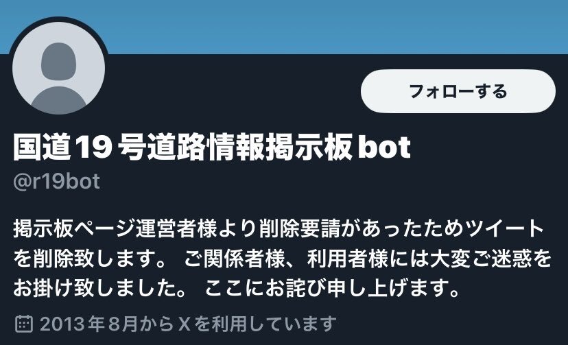国道19号で何かあった時はチェックして地味に情報収集していた掲示板が閉鎖。 Xのアカウントもこの掲示板があったため停止したようですが、この機会にまた復活してもらえませんか? @r19bot #国道19号 #R19 pic.x.com/k44VcrTNts