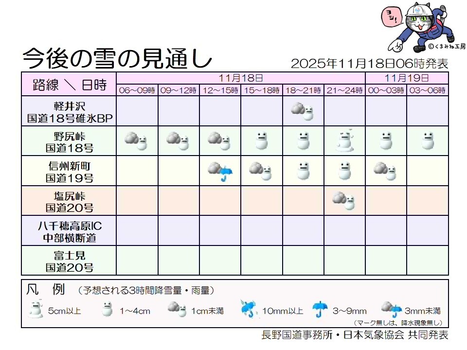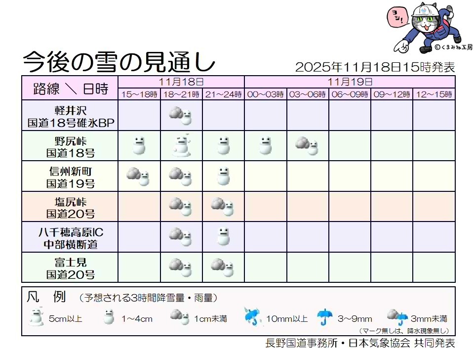【#道路情報 #雪 情報 】 #長野国道事務所 管内では、本日18日(火)の夜は、#国道18号 、#国道19号 、#国道20号 、#中部横断道 など各地で降雪予測です。ご通行の際は冬用タイヤの装着、チェーンの早めの装着をお願いします。 長野国道HP ktr.mlit.go.jp/nagano/nagano_… pic.x.com/hMtUIv9FsX
