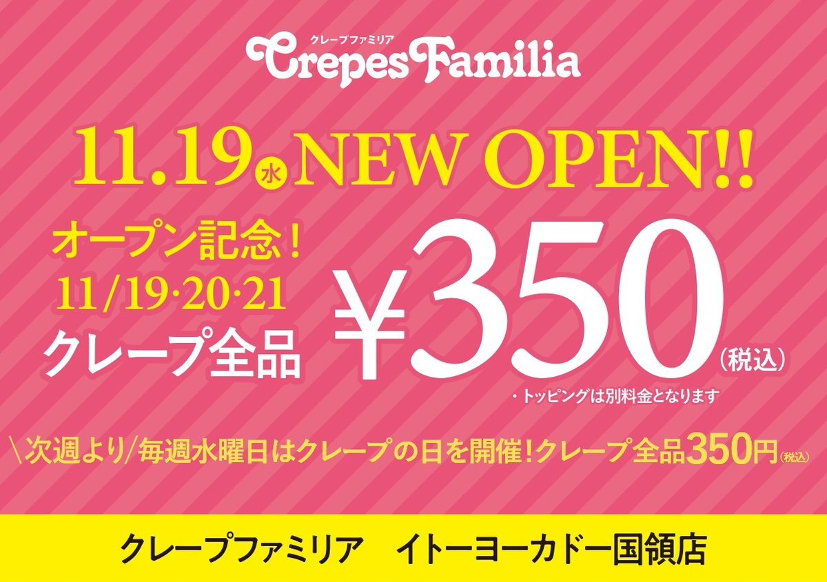 【新店オープン情報✨】 11/19(水)「CrepesFamilia イトーヨーカドー国領店」をオープン! オープンを記念して、11/19(水)~11/21(金)まで 「クレープ全品350円(税込)」のオープン記念セールを開催します💖 ※トッピングは別料金となります 皆様のご来店お待ちしております♪