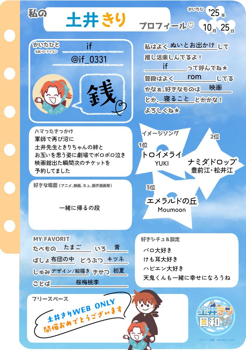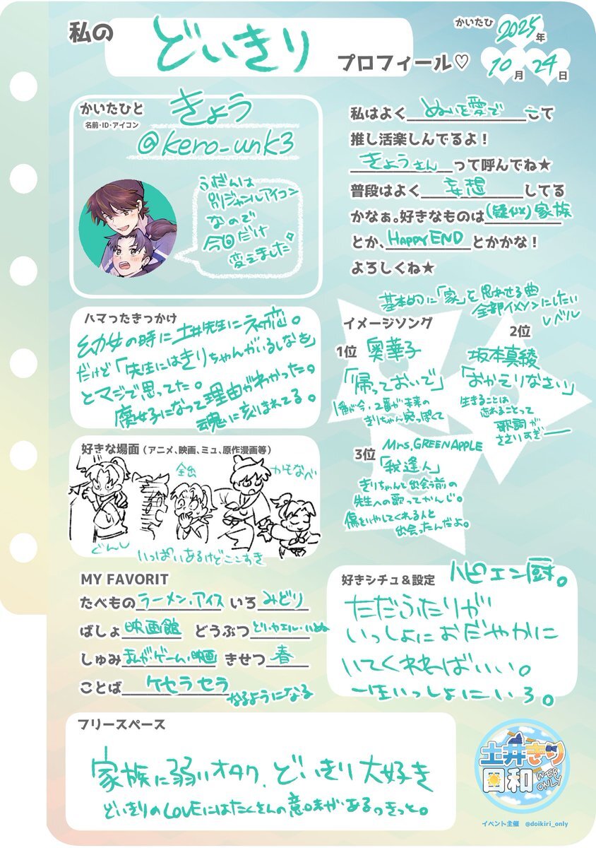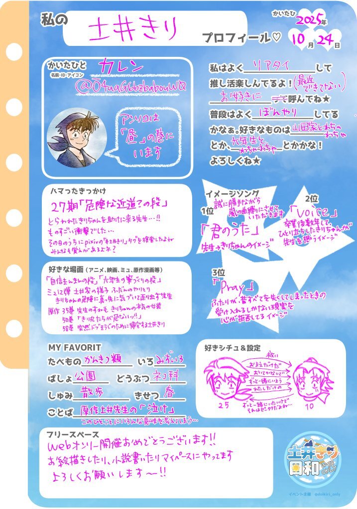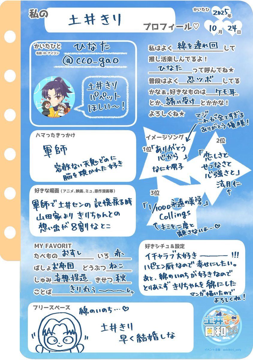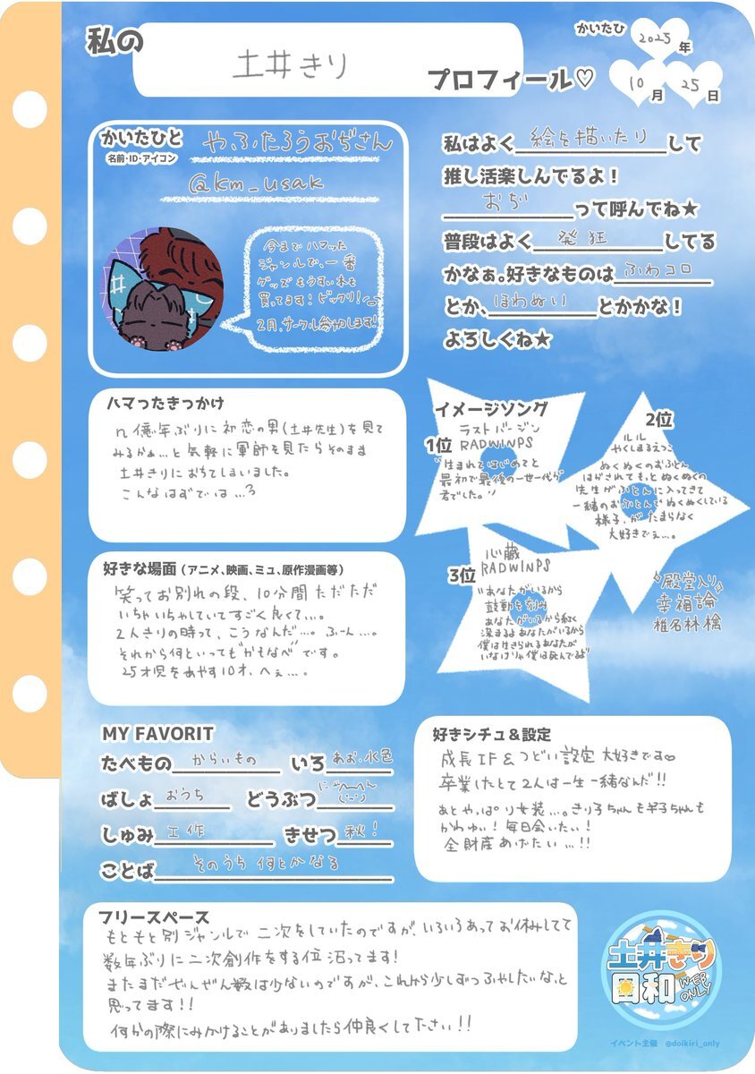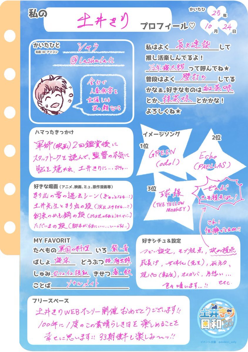 Webオンリー開催おめでとうございます🎈そしてありがとうございます〜!とっっても楽しみです! 一般参加ですが、テンプレートお借りして書いてみました #土井きりプロフ日和 pic.x.com/i6yeVF4T43
