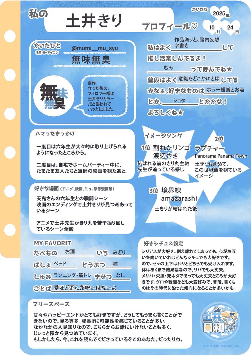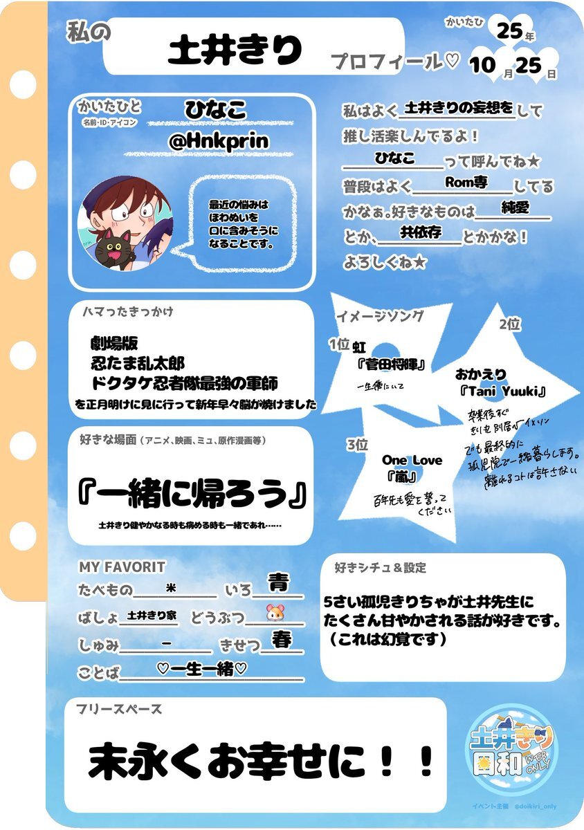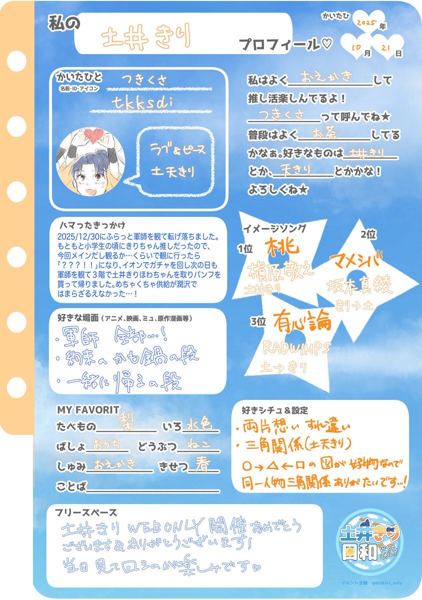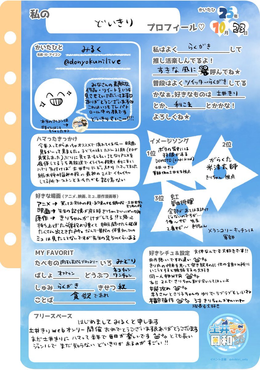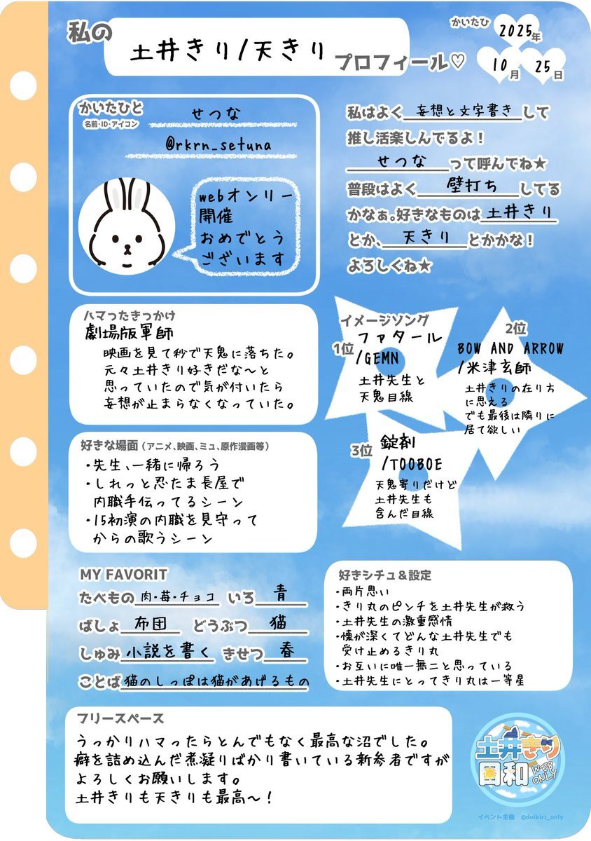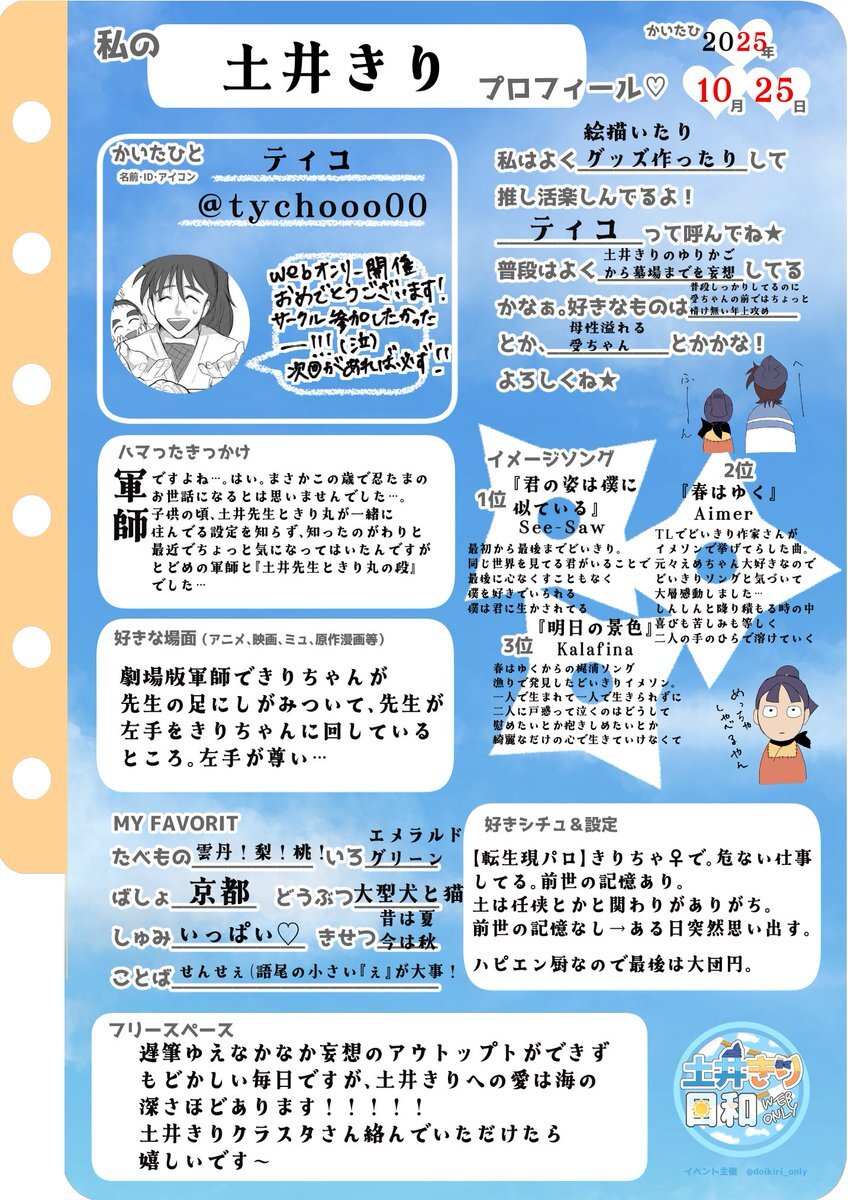 Webオンリー開催おめでとうございます🎈そしてありがとうございます〜!とっっても楽しみです! 一般参加ですが、テンプレートお借りして書いてみました #土井きりプロフ日和 pic.x.com/i6yeVF4T43