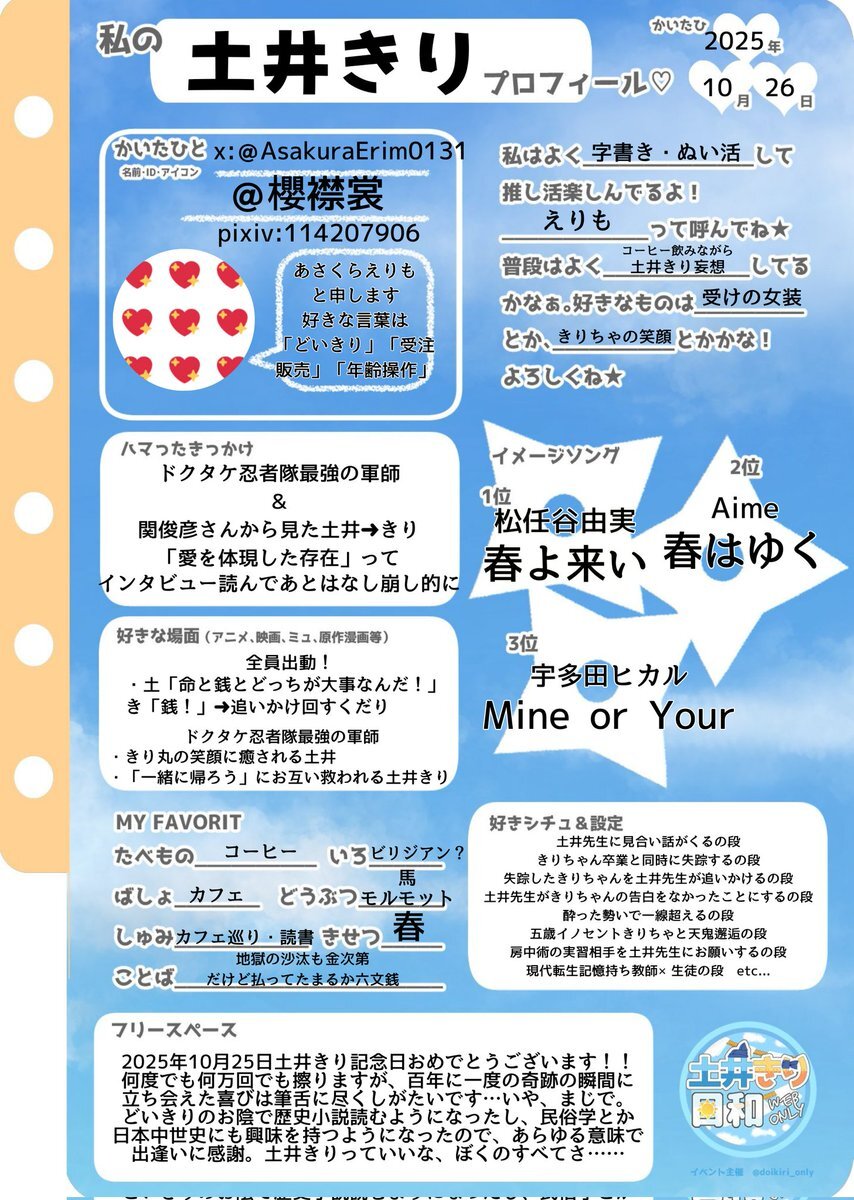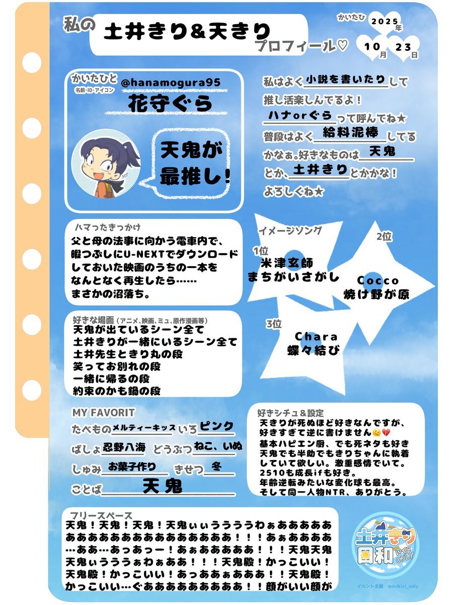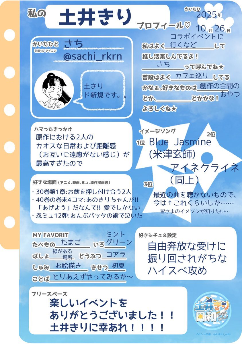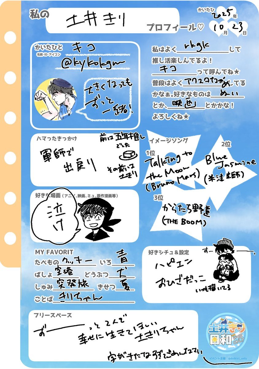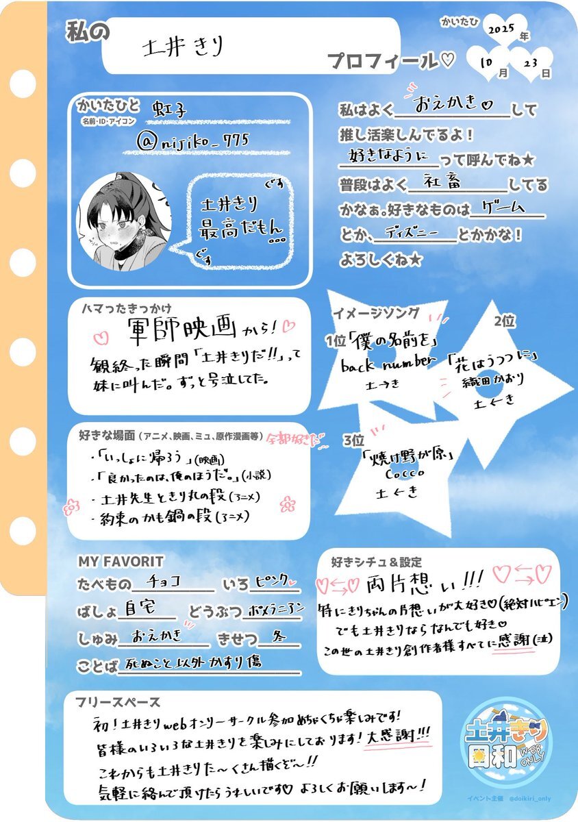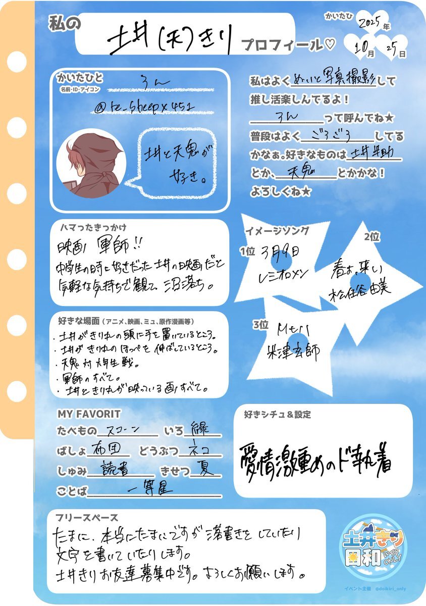 Webオンリー開催おめでとうございます🎈そしてありがとうございます〜!とっっても楽しみです! 一般参加ですが、テンプレートお借りして書いてみました #土井きりプロフ日和 pic.x.com/i6yeVF4T43