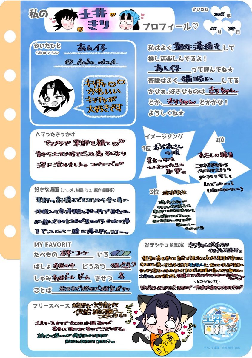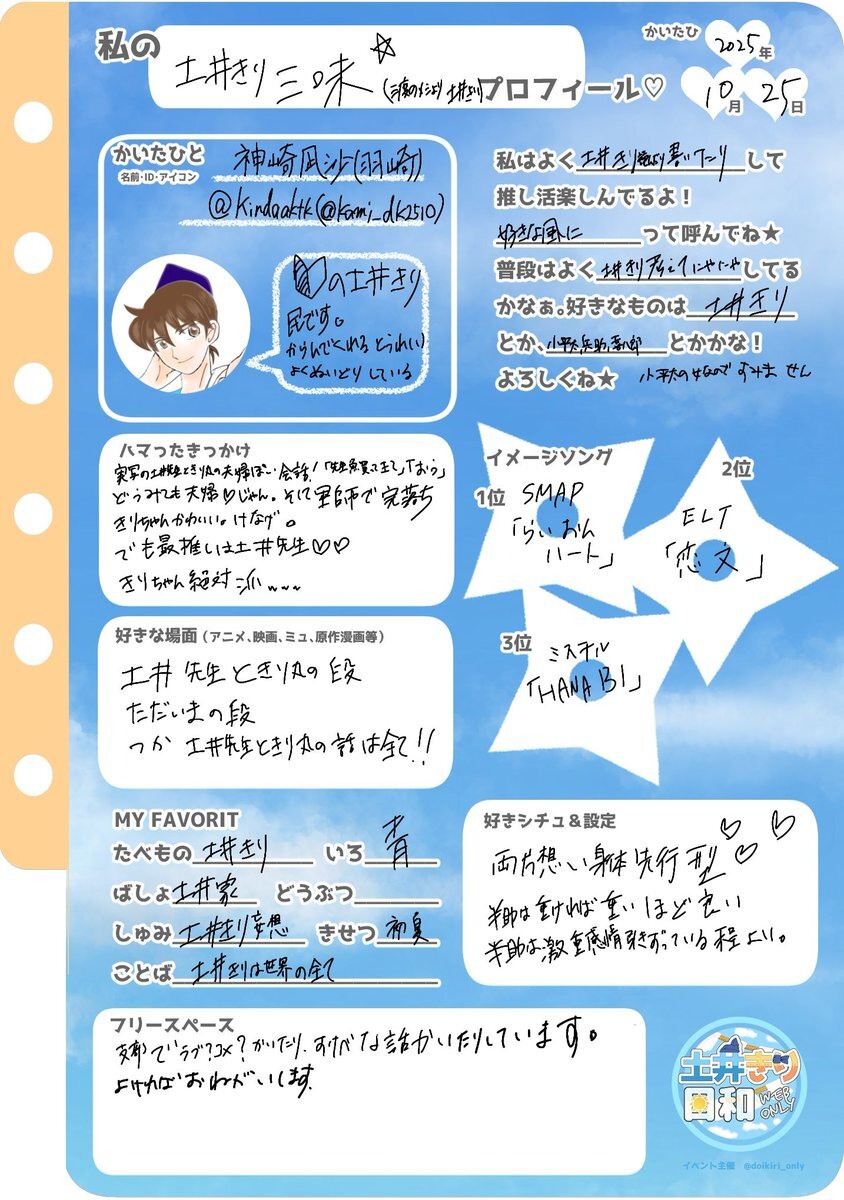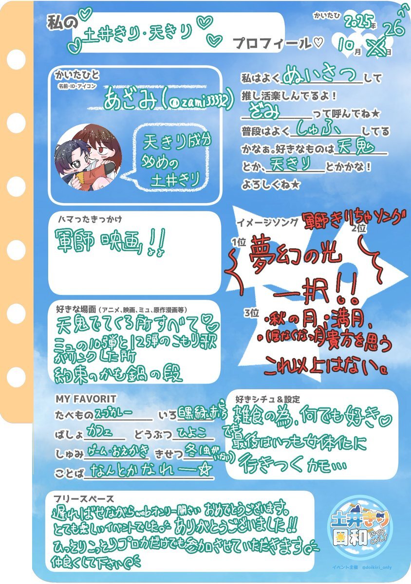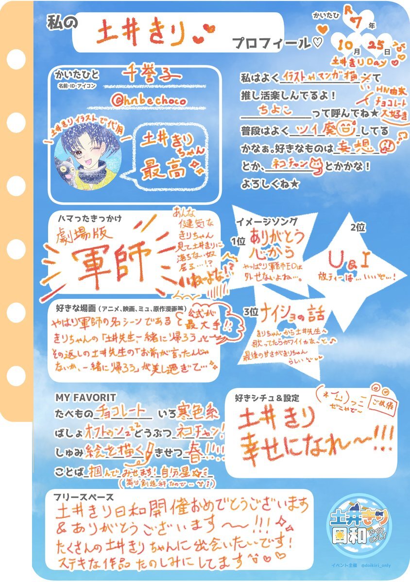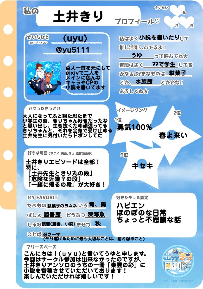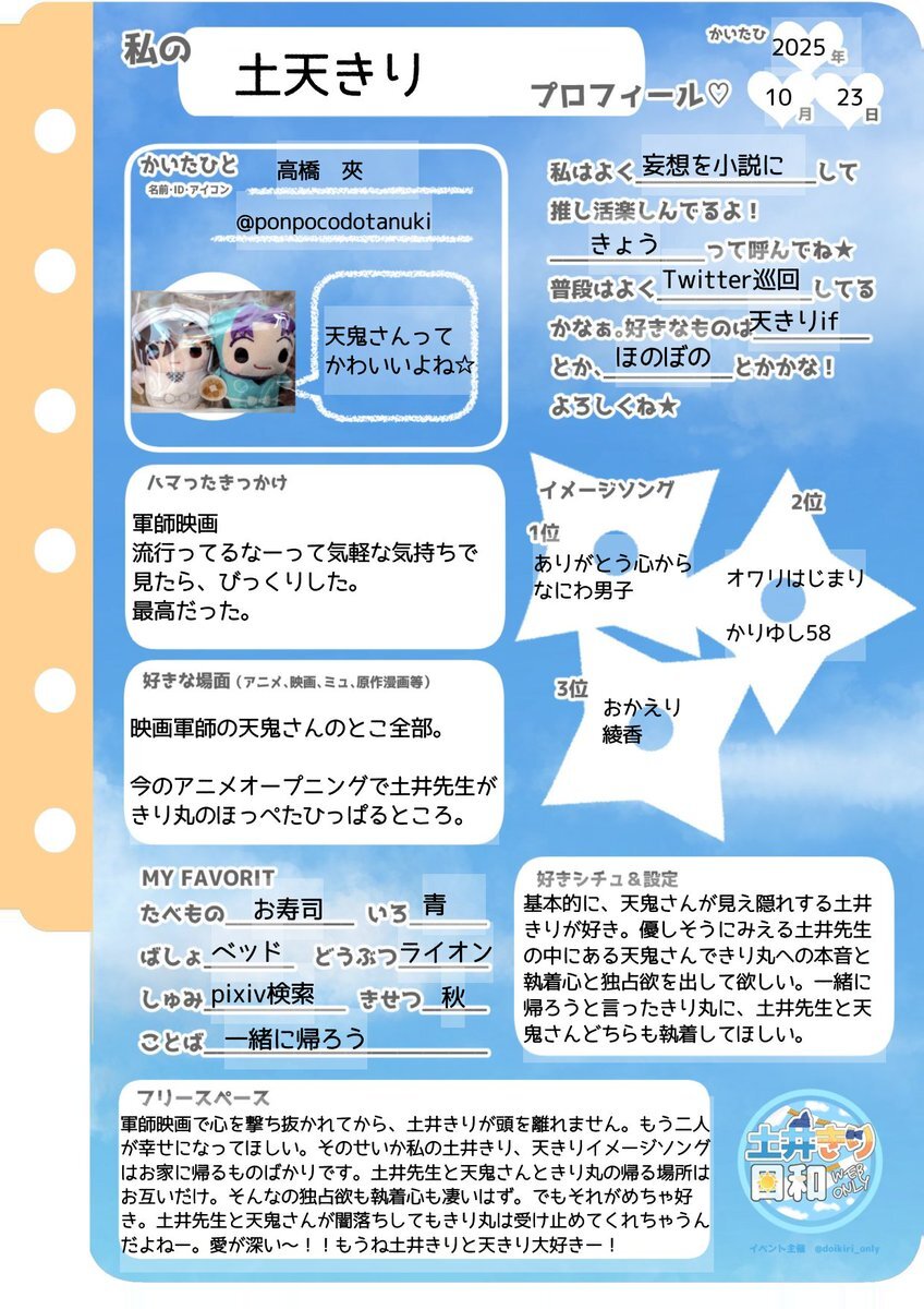 Webオンリー開催おめでとうございます🎈そしてありがとうございます〜!とっっても楽しみです! 一般参加ですが、テンプレートお借りして書いてみました #土井きりプロフ日和 pic.x.com/i6yeVF4T43