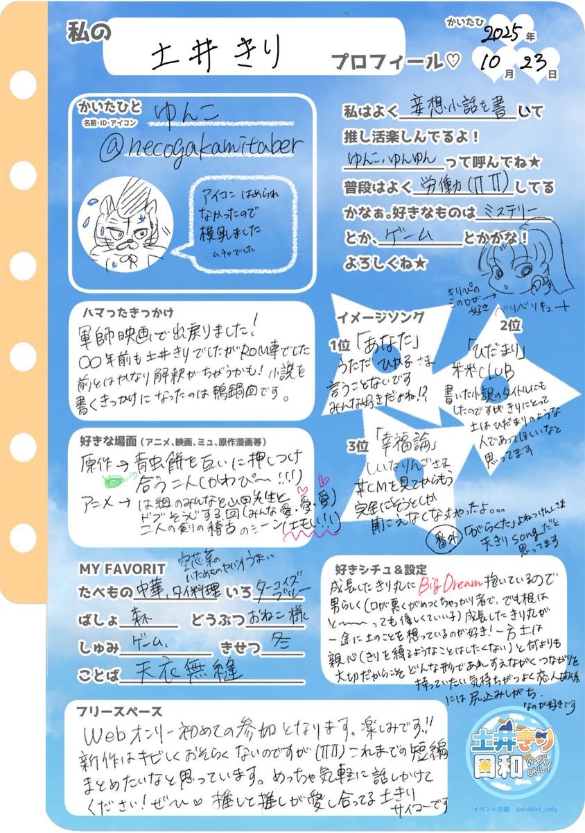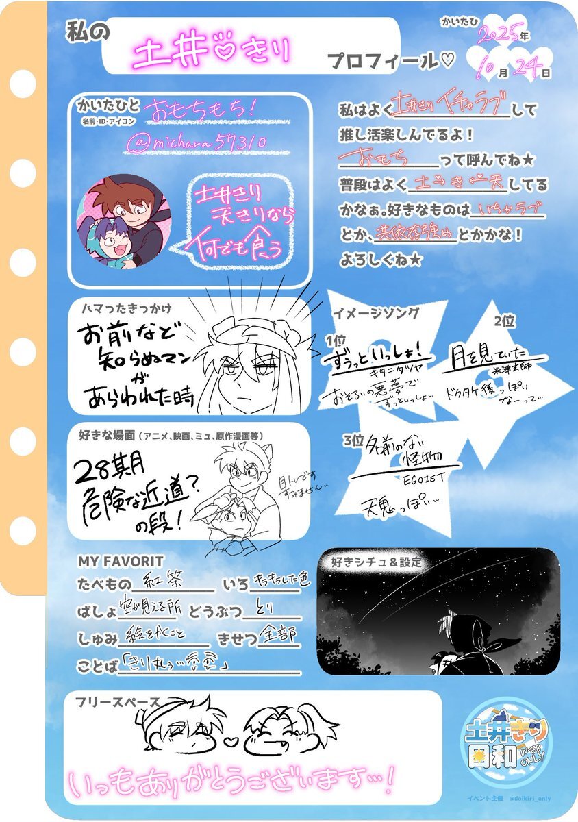 #土井きりプロフ日和 おはようございます! 今日は一般参加でいろんなサークルにお邪魔したいです! アンソロでは「東雲の彩」に参加させていただいております(^▽^)/ よろしくお願いしますm(_ _"m) アイコンはフォロワーさんに描いていただいたもので、とってもお気に入りです❤ pic.x.com/I79wLYMV2r