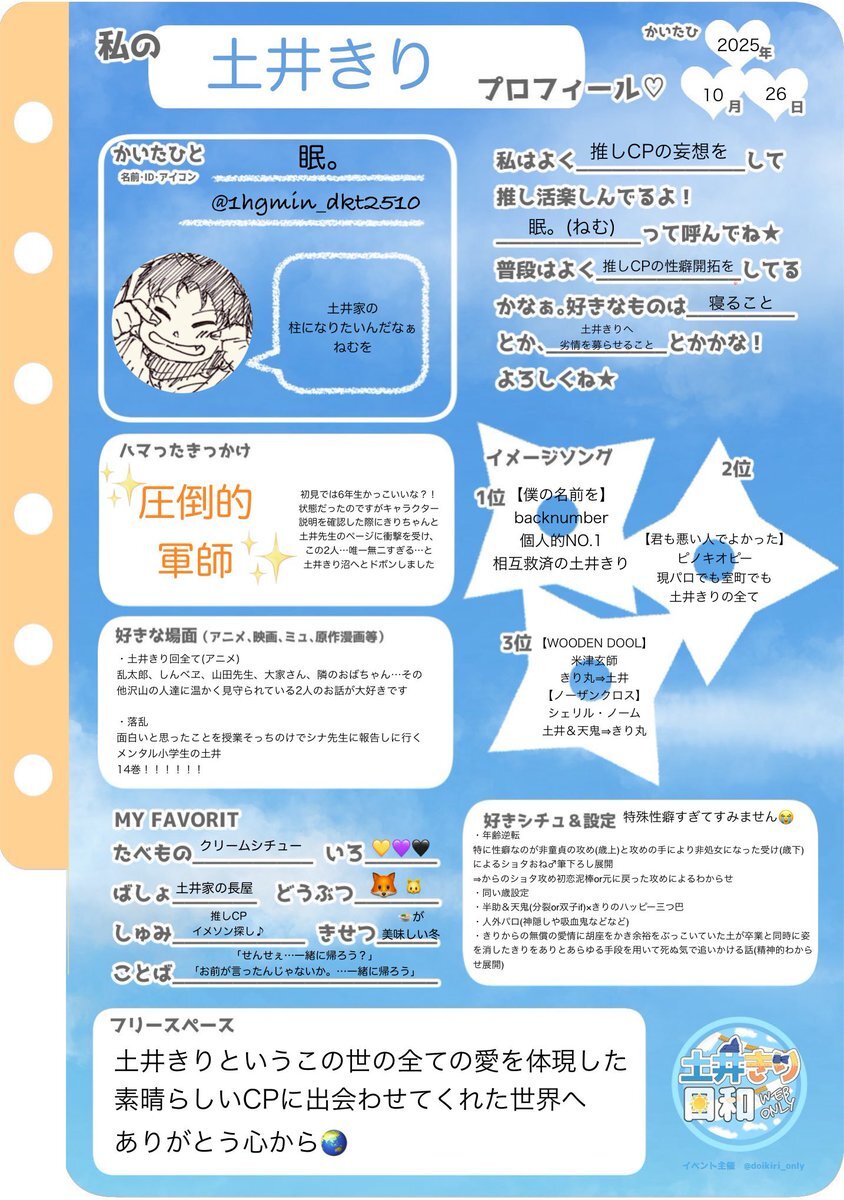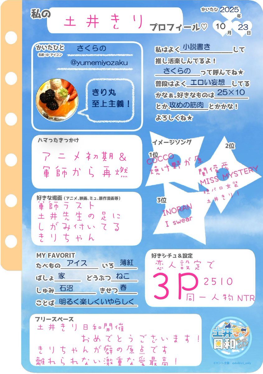 土井きりwebオンリー開催おめでとうございます!!✨✨サークル参加したかった〜〜😂プロカだけでも!と参加させていただきます😂 素敵な企画をありがとうございました!✨✨ #土井きりプロフ日和 #土井きり日和 pic.x.com/N1sEesQ0cz