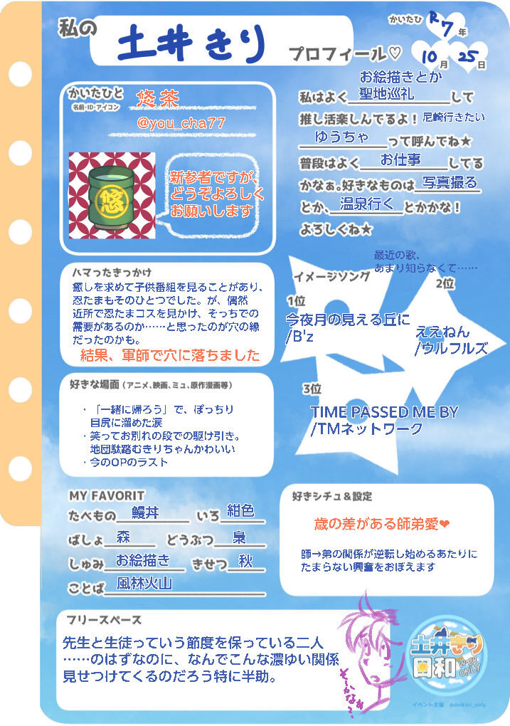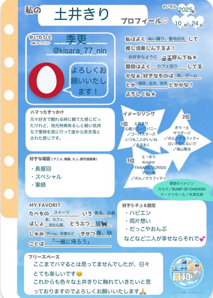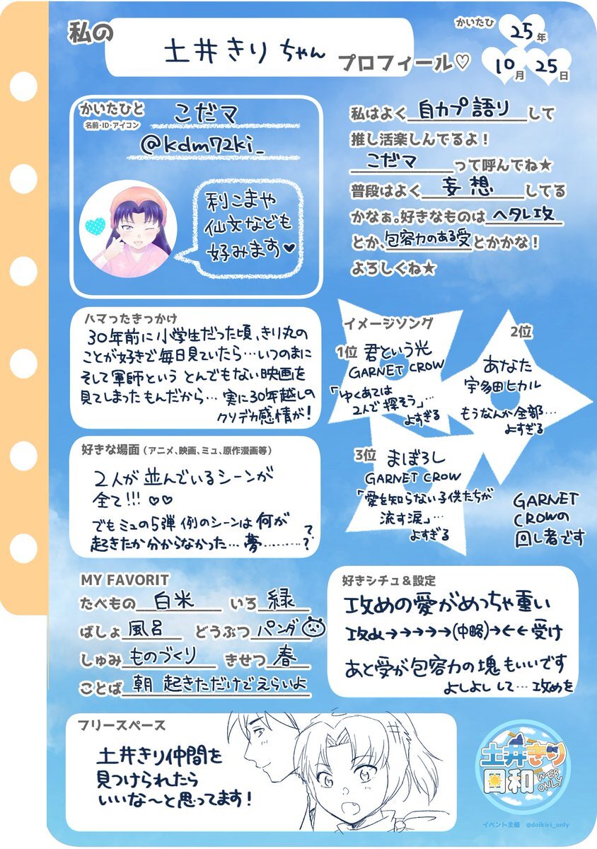 イベント当日の参加は難しいのですが、女児心が抑えきれずプロフのみ参加させていただきました! 全然面白いこと書けませんでしたが、どうぞ宜しくお願いいたします! #土井きりプロフ日和 pic.x.com/pbwbakPVuv