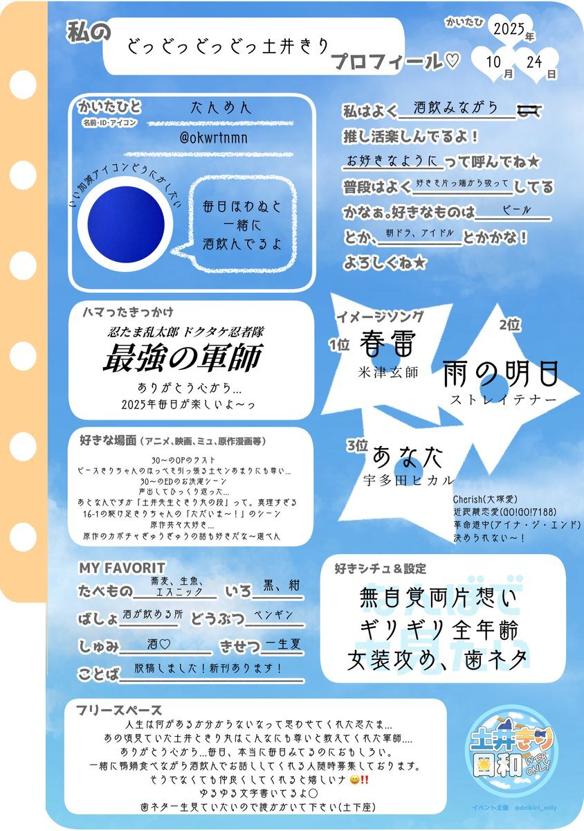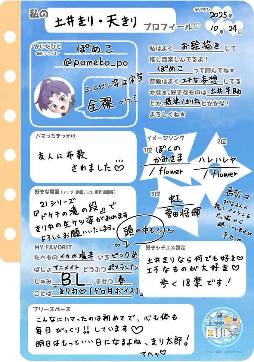 テンプレートお借りしました、ありがとうございます たまに絵を描いたりデザインして土井きりへの思いを発散してます。本日は土井きりweb only開催おめでとうございます! #土井きりプロフ日和 pic.x.com/3Z45QiTBFM