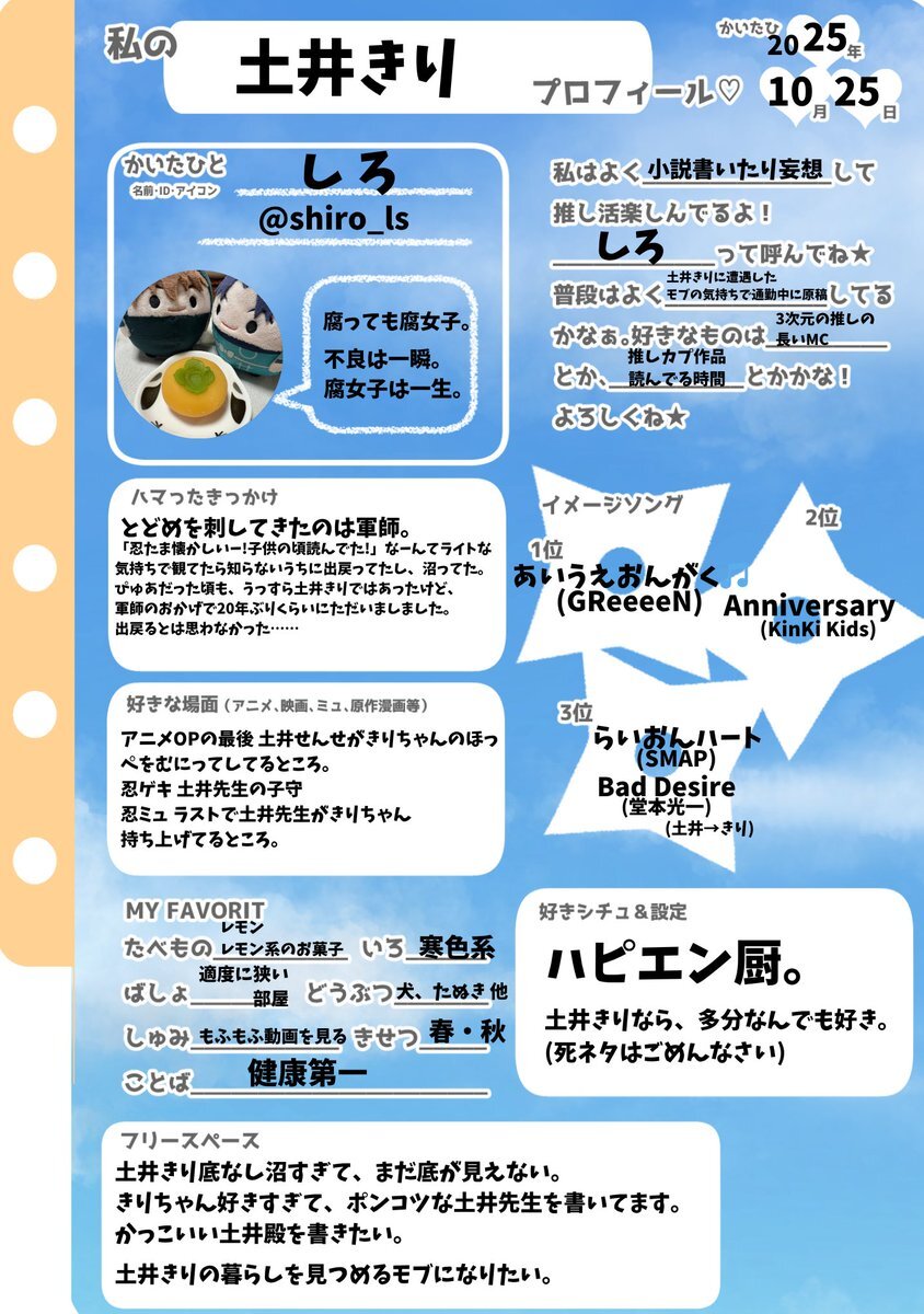 一般参加ですが、プロフ書いてみました~🥰 みなさんの考える土きイメソンが知れる素晴らしいタグ!!💖 素敵な企画をありがとうございます♡♡ #土井きりプロフ日和 pic.x.com/0R2rUZAto2