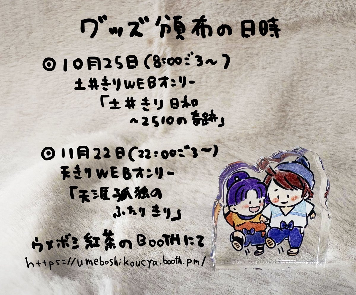 #土井きり日和 #土井きり日和_通販 10月25日のWEBオンリー合わせで頒布するグッズです! ・ミニアクリルブロック ・メガネ拭き その他もしかしたらpixivファクトリーで何かグッズが出る可能性が微レ存。 ウメボシ紅茶booth店にて販売予定です! umeboshikoucya.booth.pm pic.x.com/QPiMdUqWXr