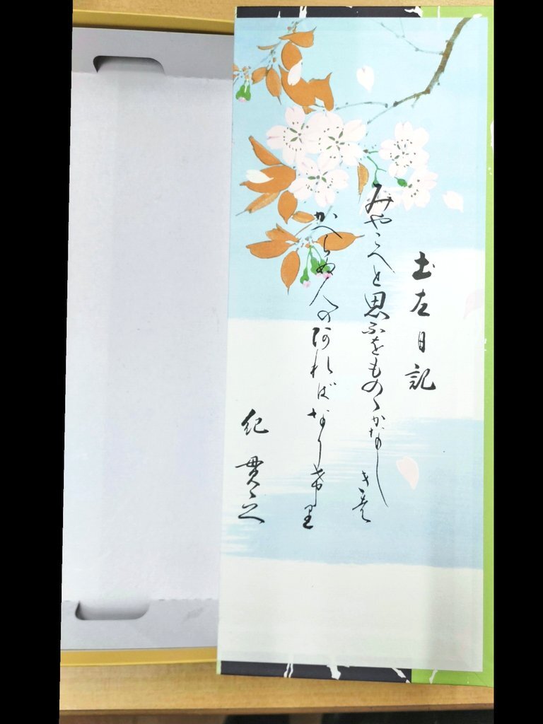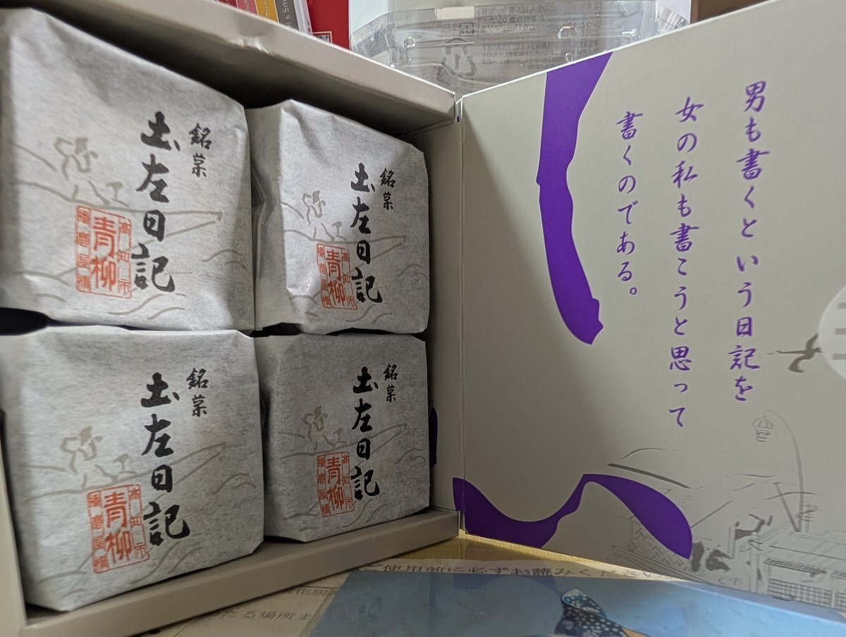 とある教室にあったお土産菓子箱である。「男もすなる日記といふものを…」で著名な紀貫之『土左日記』。ん?ニンベンがない? 古典文学の先生によれば「藤原為家の写本は『土左日記』となっいて…」とのこと。箱の裏書きを見るとやはり高知県の土産品だった。#土佐日記 #土左日記 #紀貫之 pic.x.com/u9cJWdbhd8