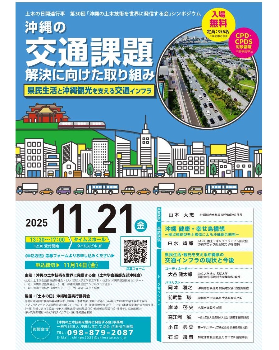 土木の日関連行事 第30回「沖縄の土木技術を世界に発信する会」シンポジウムが開催されます。 県民生活と沖縄観光を支える交通インフラに関する内容です。残席ある場合は当日受付可能となっております日時:令和7年11月21日(金)13:30~ 場所:タイムスビル3Fタイムスホール #土木の日2025 pic.x.com/aBnuednO4I