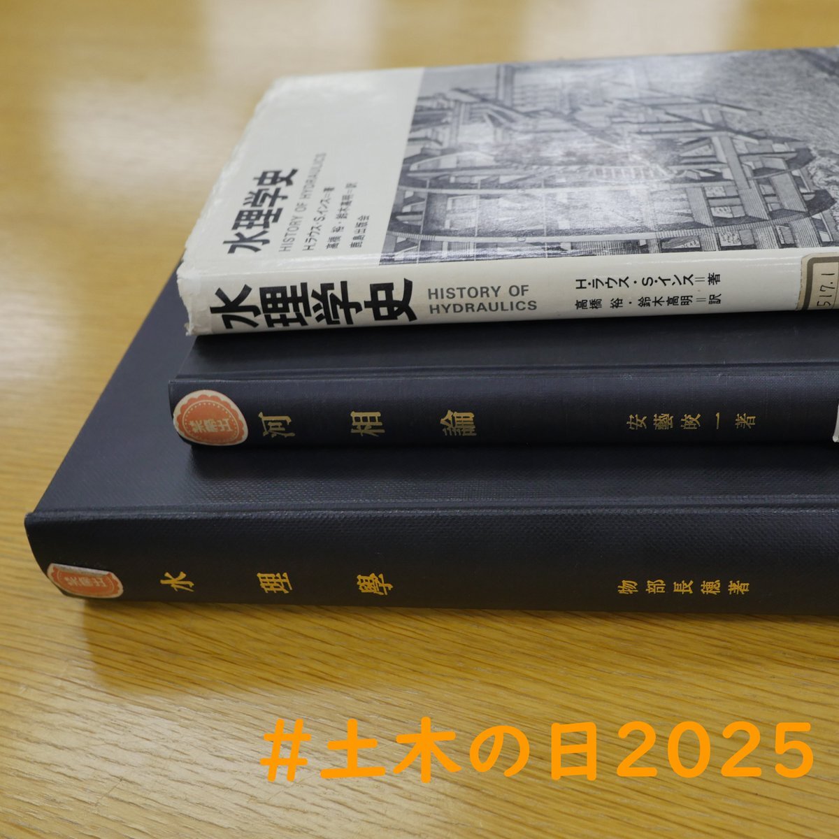 国総研図書館所蔵図書。 下から、内務省土木試験所第3代所長 物部長穂著:水理学(1933(昭和8)年)、第6代所長 安芸皎一:河相論(1944(昭和19)年)、H・ラウス・Sインズ著 高橋裕・鈴木高明訳:水理学史(1974(昭和49)年)。 先人達の積み重ねの上に今の時代がある。 #土木の日2025 pic.x.com/CxZ0j8NJX9