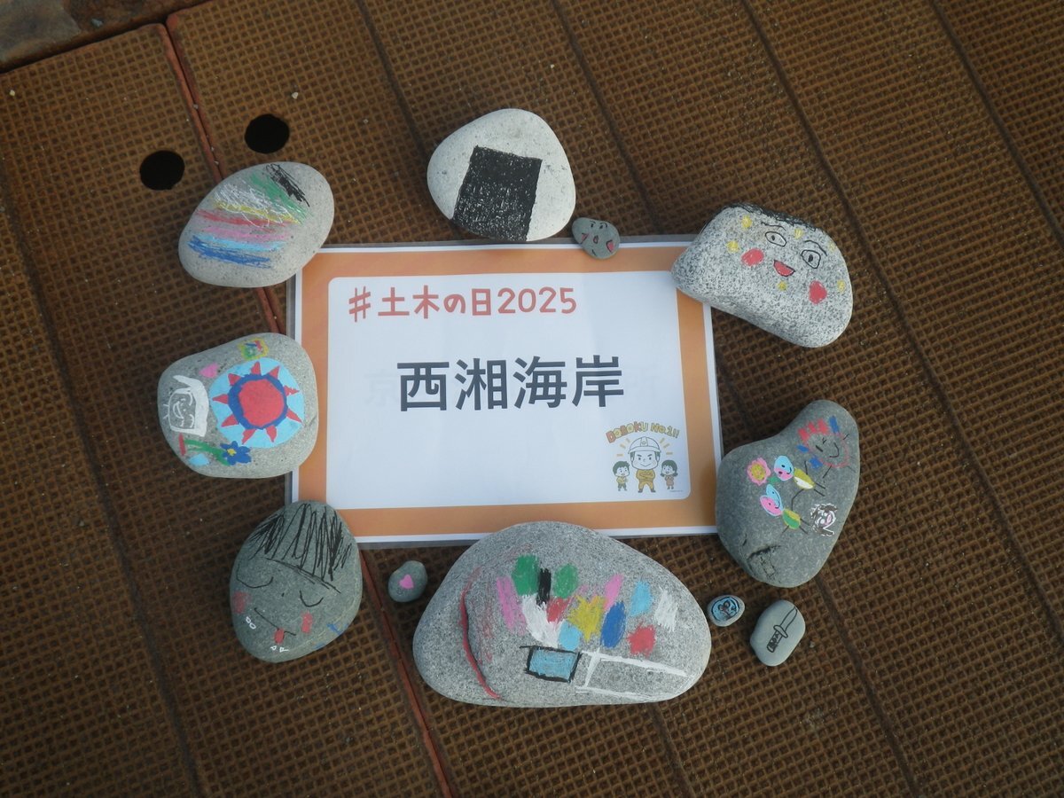 先日の現場見学会にて参加者の皆様に書いてもらった石の絵です。かわいらしい絵ばかり!!! 「土木の日」「西湘海岸」が映えますね~🎨 #土木の日2025 #西湘海岸 #二宮 pic.x.com/cHAXXLDCDf