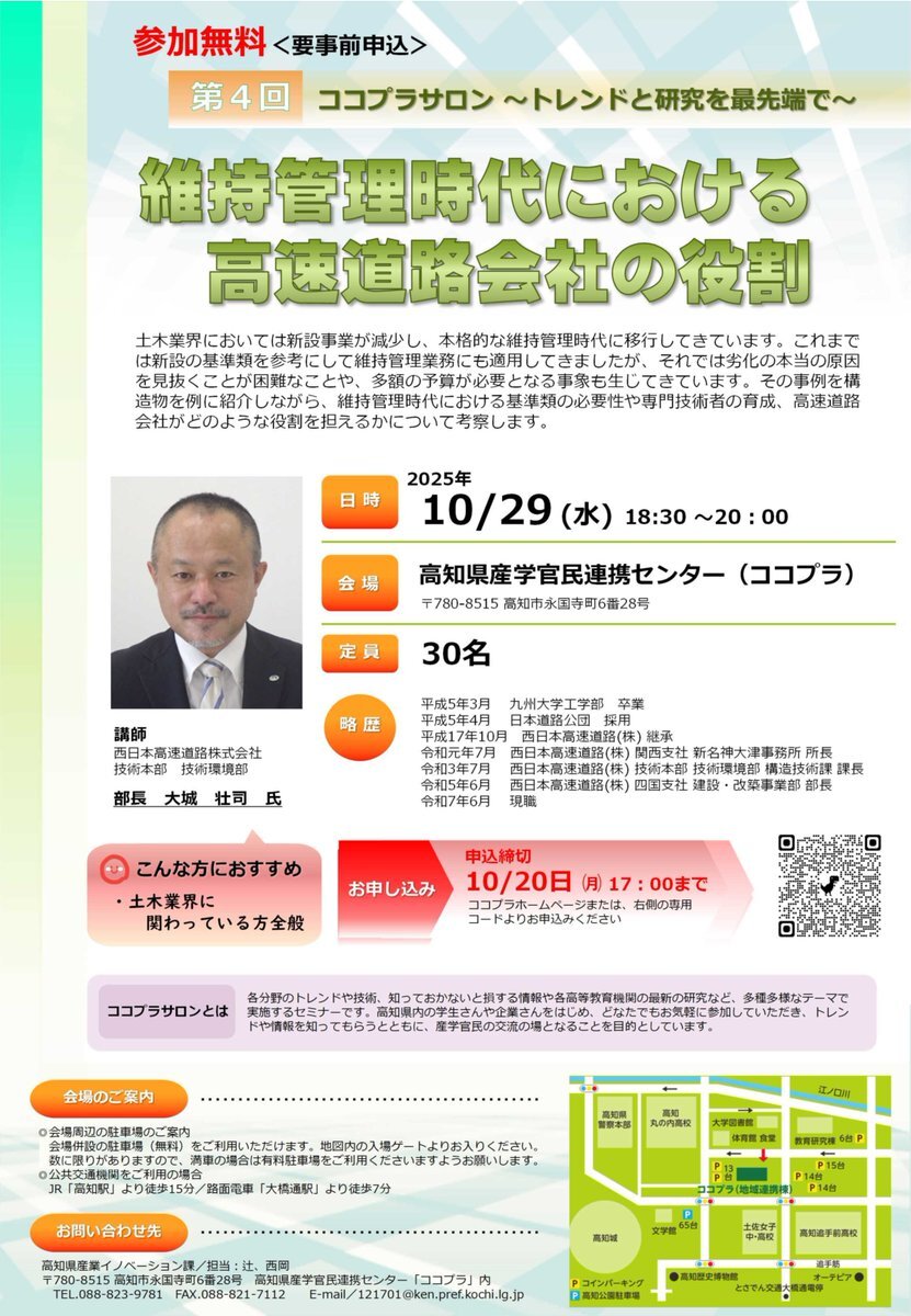 🚧新設から維持管理へ!土木業界の転換点 #ココプラサロン テーマ:維持管理時代における高速道路会社の役割 📅10/29(水)18:30~ 📍ココプラ 👤講師:西日本高速道路(株) 大城壮司 氏 💰参加無料 劣化原因見極め、基準類の必要性、技術者育成を解説! kocopla.jp/page.html?id=2… #インフラ #土木技術 pic.x.com/EbonAiozsm