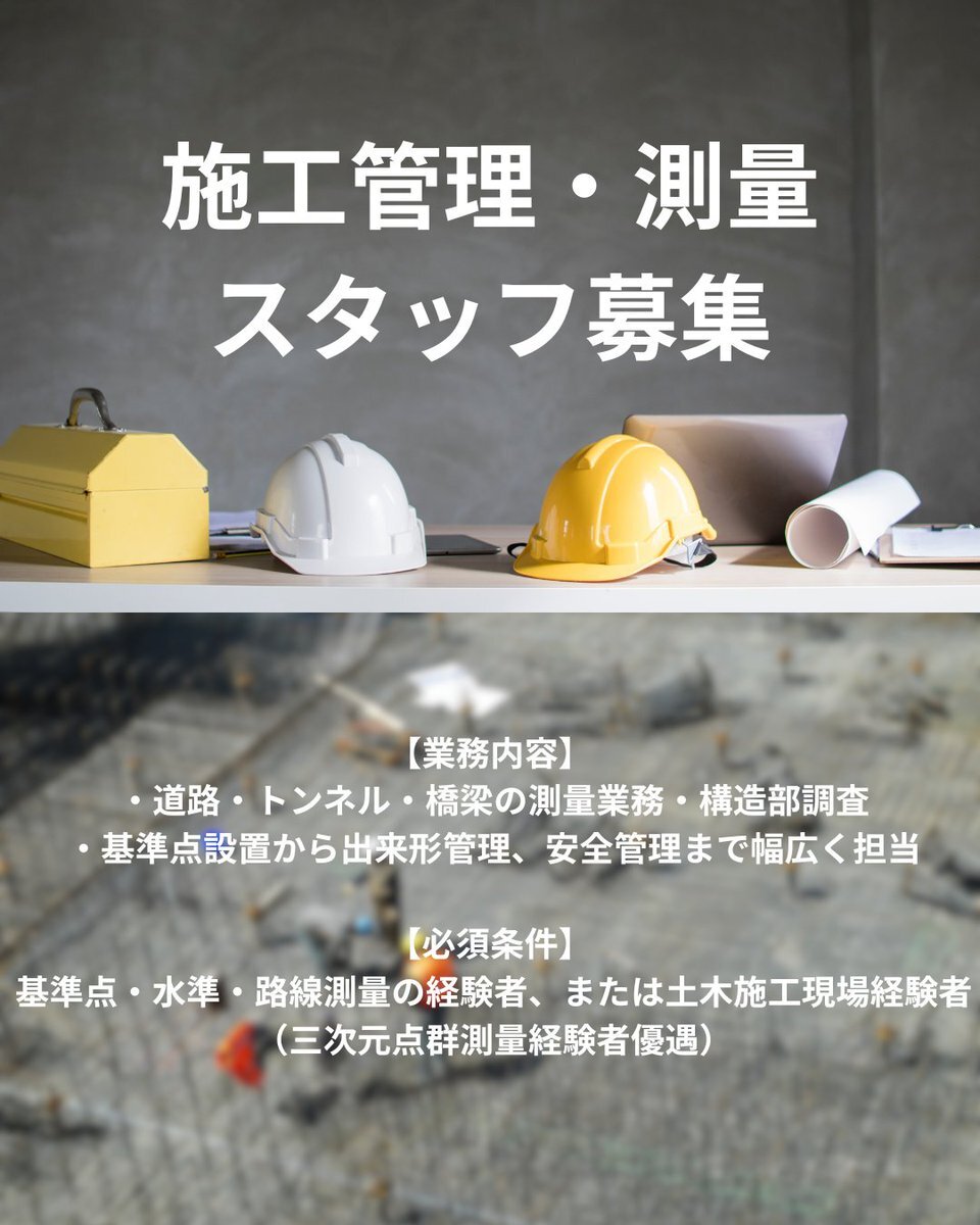 【施工管理・測量スタッフ募集】 公共測量や構造物調査も対応。AutoCADやUAVを使った最新技術も学べる! 残業代全額支給&土日祝休み。資格取得支援&社宅完備。千葉エリア勤務! 詳細はこちらのリンクから!x.gd/xOgVU #施工管理 #測量 #土木施工管理 #残業代全額支給 #建設業 #千葉求人 pic.x.com/OrhZUxhp4Z
