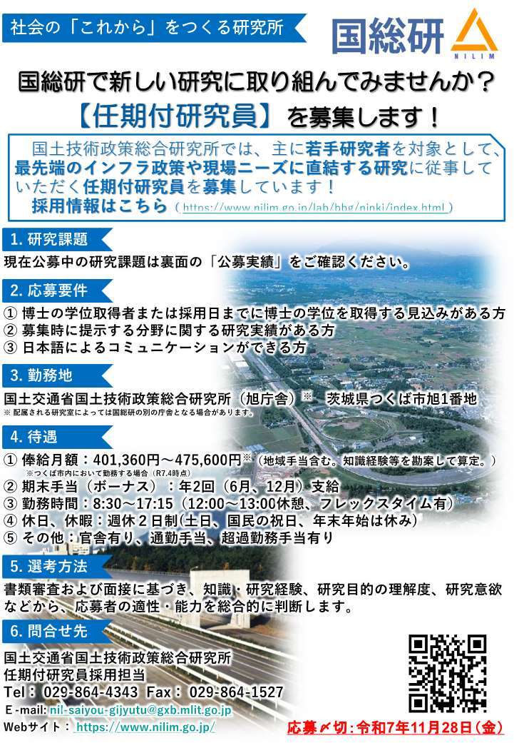 #研究職員の募集(3/7)】 研究課題: 道路交通騒音の予測手法と対策技術に関する研究 応募〆切:R7.11.28 採用日:R8.4.1 ご応募お待ちしております! #国総研 #道路交通騒音 #環境音響工学 #交通工学 #土木計画学 詳細は↓ nilim.go.jp/lab/bbg/ninki/… pic.x.com/RCzrGXPRnl