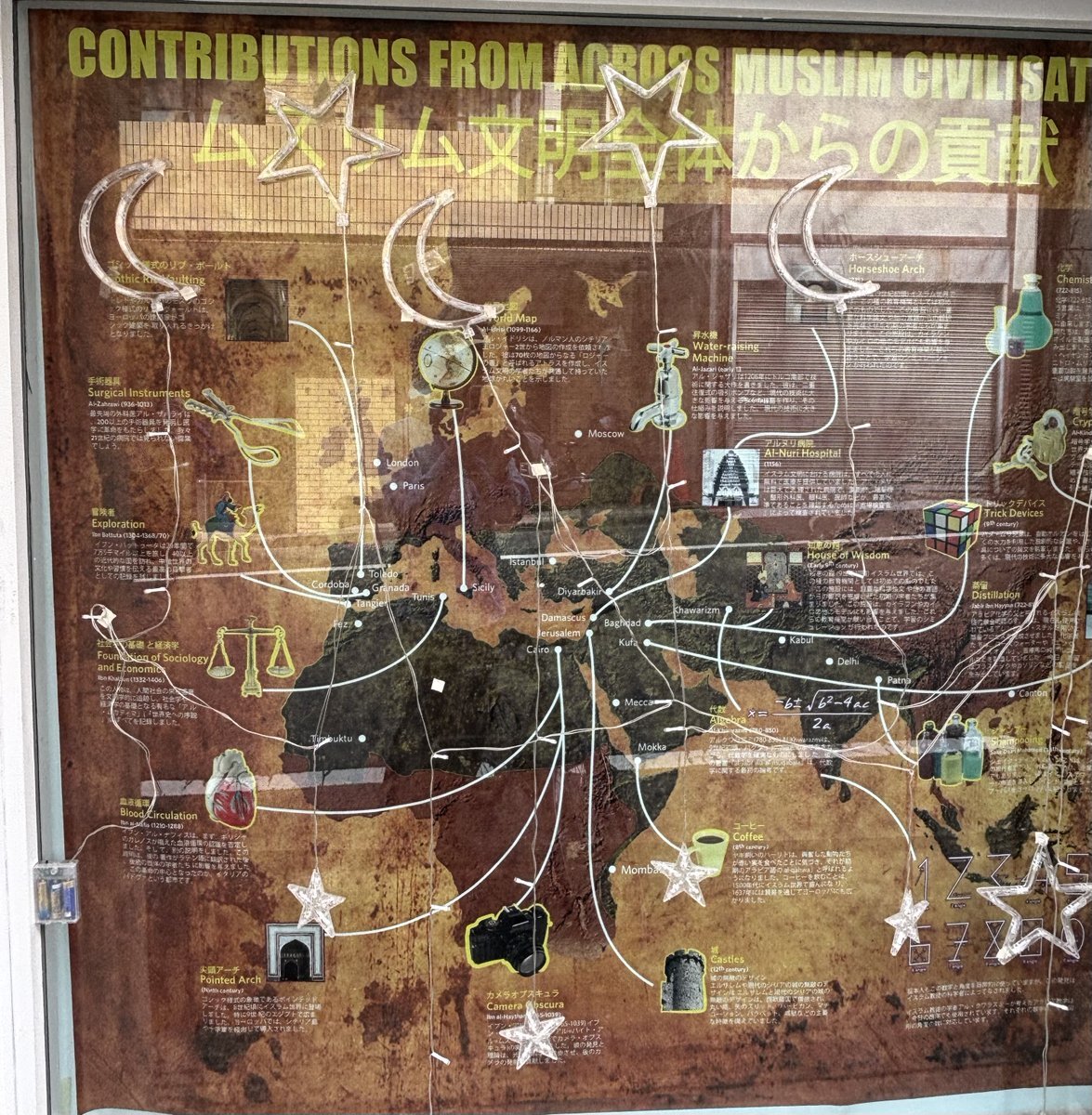 一昨日訪れた大塚駅近くのモスク(マスジド大塚)。そのハラール部門事務所の入り口に貼られた「ムスリム文明全体からの貢献」の巨大ポスター。 どれだけ歴史の中でムスリム文明が今に繋がるものを生み出し広げてきたのかを力説しています。 x.com/kosakaeiji/sta…