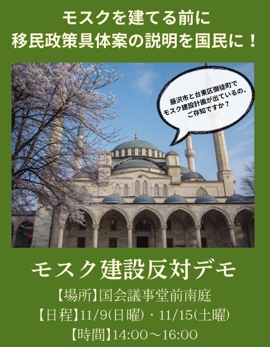 返信先:@GrwaNnKqMn5nG68恐れ入ります。モスクに触れていたので宣伝させて下さい(私が主催ではないのですが)。 東京でも11月9日と15日に国会議事堂南庭でモスク建設反対デモが行われます。 移民政策に少しでも思う所ある方も興味ある方も、無関心な方も是非来てほしいです。移民問題は世界規模の問題です。