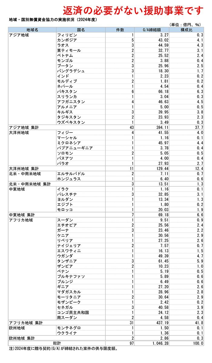 国際協力とは何か 多文化共生とは何か もう1度立ち止まって考えませんか? 開発途上国へのSDGs支援 JICA 無償資金協力 所得水準の低い諸国を中心に、教育、保健医療、運輸、環境分野などの開発に必要な資金を贈与する、返済の必要がない援助事業です。 昨年は1046億円