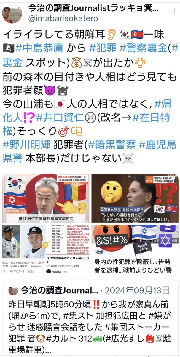 #警察 も #統一教会 や #在日 #韓国・朝鮮人 に乗っ取られていて、#安倍晋三 らと共犯です🏴☠️ 既に #警察 #検察 #司法 は、これら #在日暴力団 に乗っ取られた【#カルト #共産主義者】によって、日本人を迫害する【#秘密警察 #特高警察 #創価警察】状態です‼️😱 #在日代理支配 #GHQ #集団ストーカー犯罪 x.com/genkimu/status…