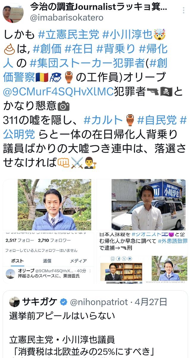 #集団ストーカー犯罪(#デマ #テロ 🔫人犯罪)の主犯 #カルト🏺#創価🇷🇴=#公明党🕵️🇰🇷🇰🇵🇨🇳🇹🇼や,ホラッチョ #デマゴーグ の人564🔫 #立花孝志(#反社会的カルト集団🏺🏴☠️→👨⚖️公認)犯罪者にフォローされている(爆笑)🤭🤣 俗物だ(笑)🤣🤭 #在日代理支配🇰🇷🇰🇵🇨🇳🇹🇼#在日特権 #GHQ #背乗り #帰化人 #同和 #暴力団💀 pic.x.com/bgURCNNbDY x.com/holymeroyoutub…