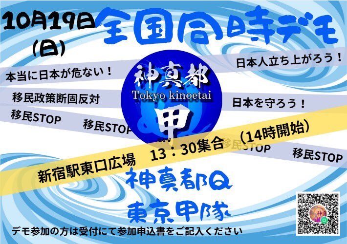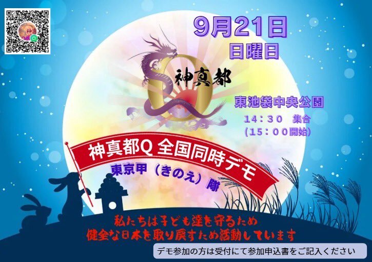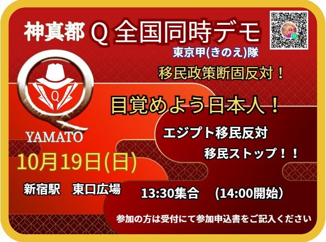 返信先:@code_economy神真都Q全国同時デモ開催  神真都Q 東京甲(きのえ)隊 9/21(日)14:30集合 15:00スタート 場所:東池袋中央公園 国が推し進めている移民政策に疑問を持たれたら、声をあげましょう #日本を守ろう #在日支配システム廃止 #移民ストップ x.com/renyae/status/…