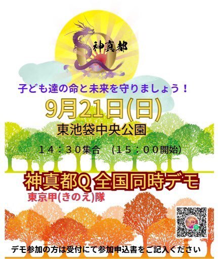 神真都Q全国同時デモ開催  神真都Q 東京甲(きのえ)隊 9/21(日)14:30集合 15:00スタート 場所:東池袋中央公園 国が推し進めている移民政策に疑問を持たれたら、声をあげましょう #日本を守ろう #在日支配システム廃止 #移民ストップ x.com/renyae/status/…
